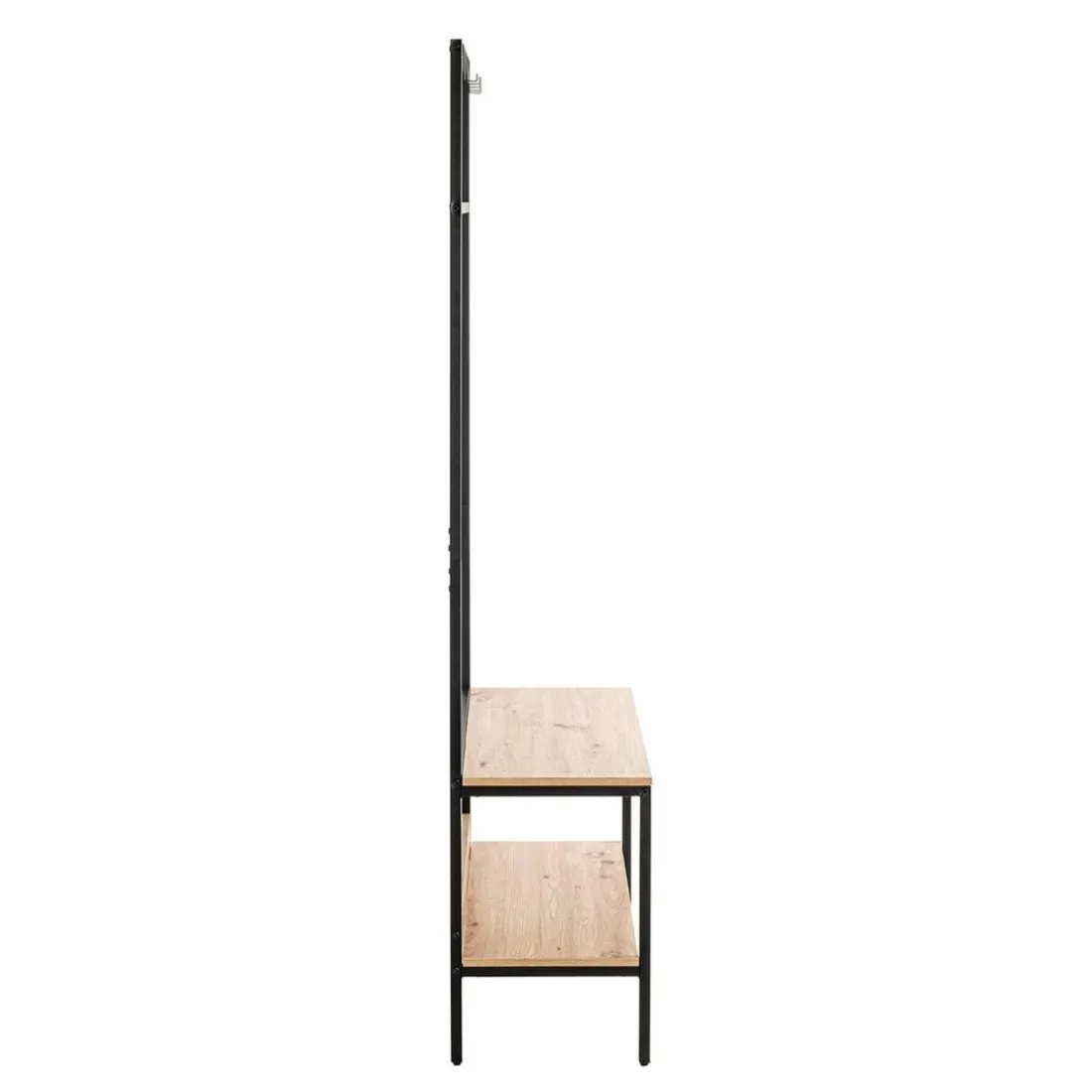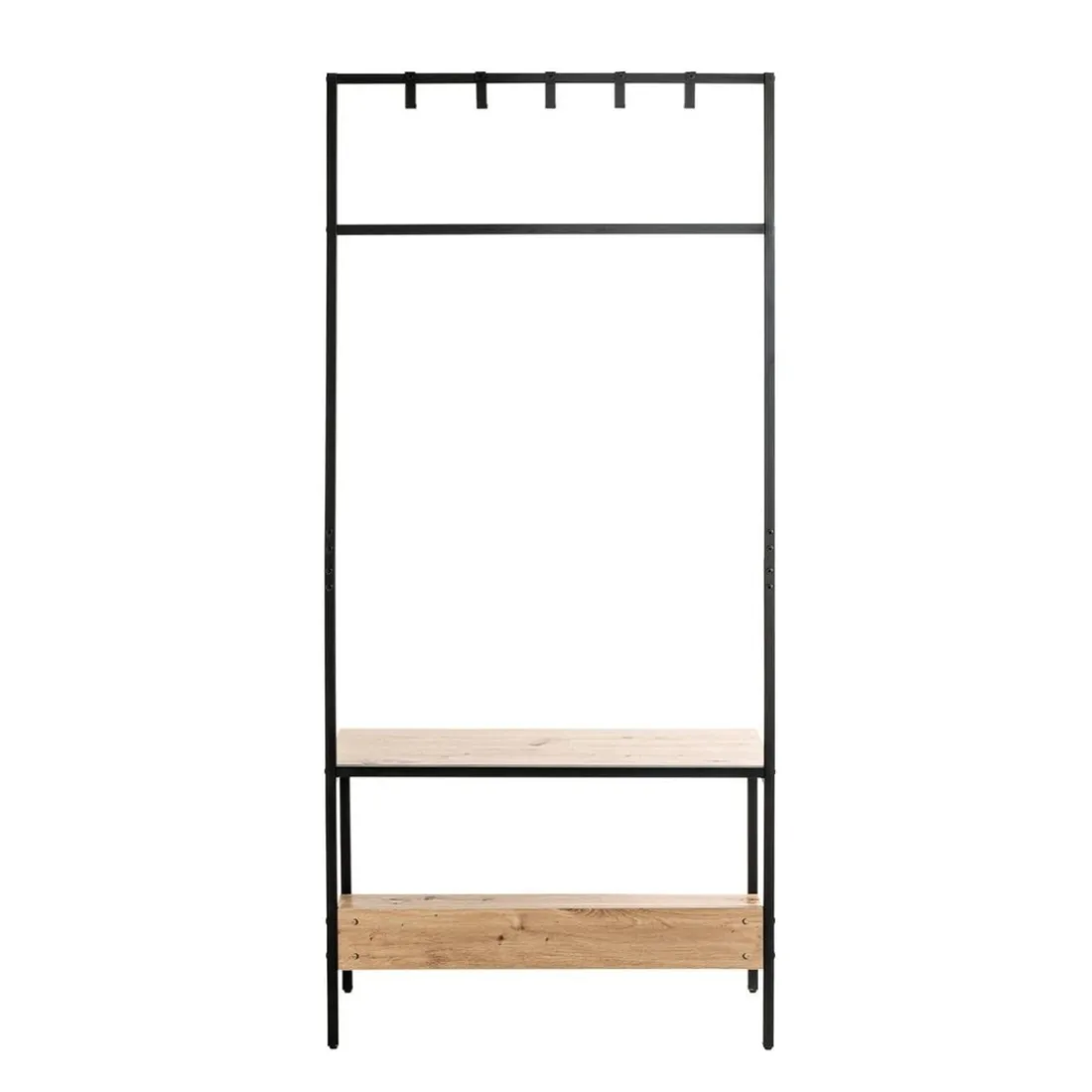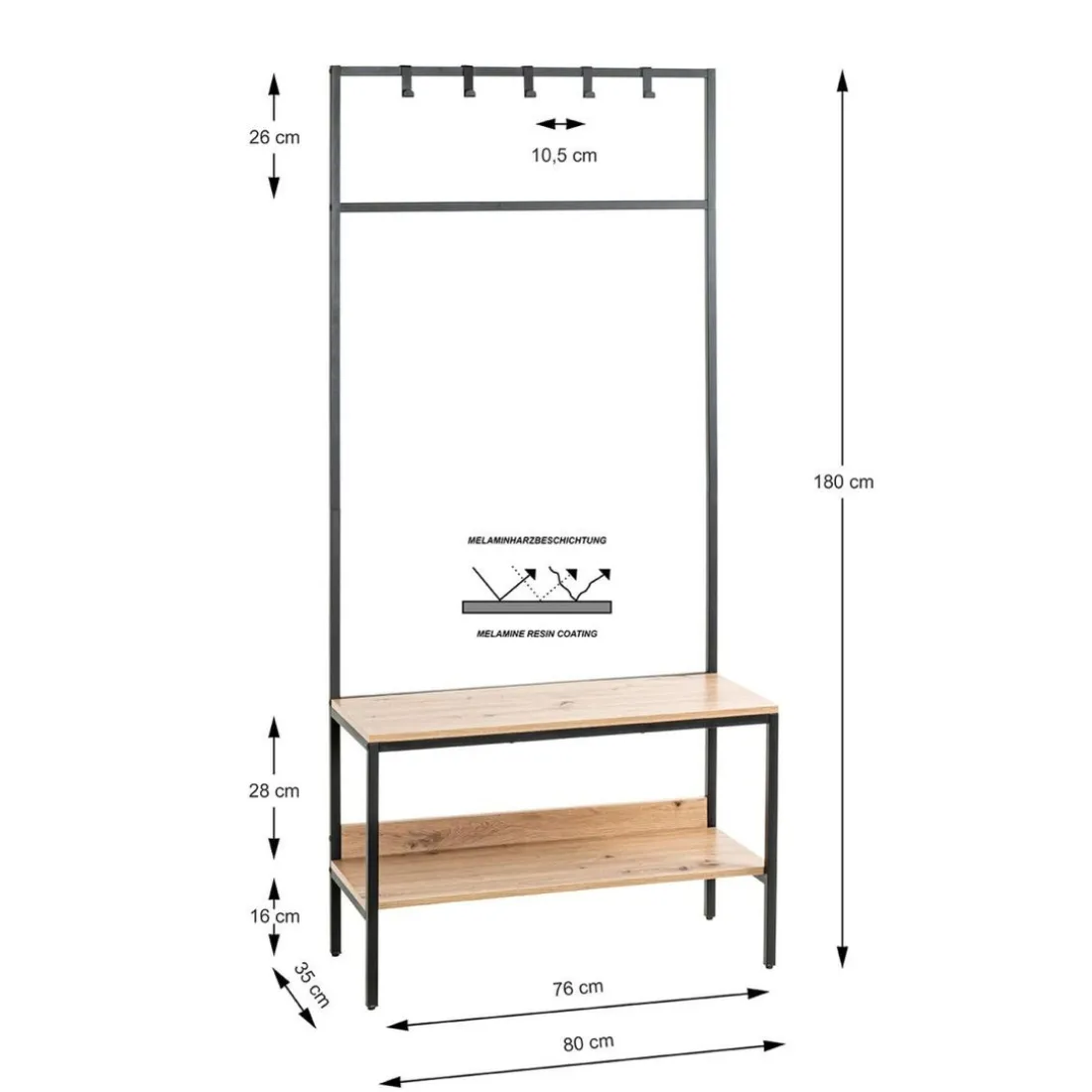en tube d’acier laqué noir avec 5 crochets et 2 plateaux, plateau de dessus en panneau de particules décor chêne