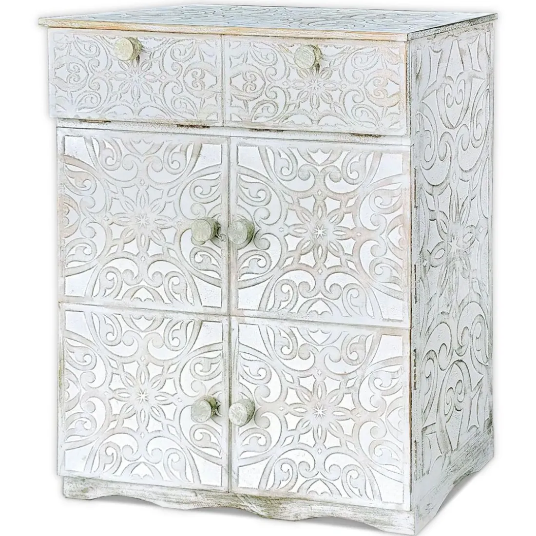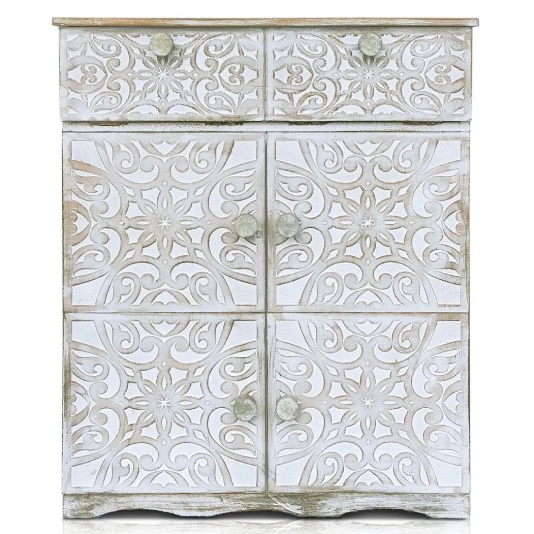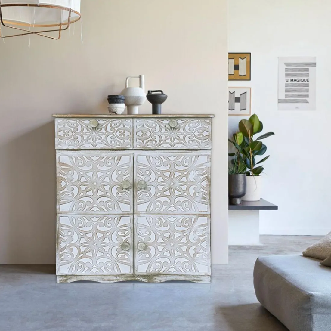 Caractéristiques Buffet bois sculpté style oriental 6 portes Matana Blanc patiné Or