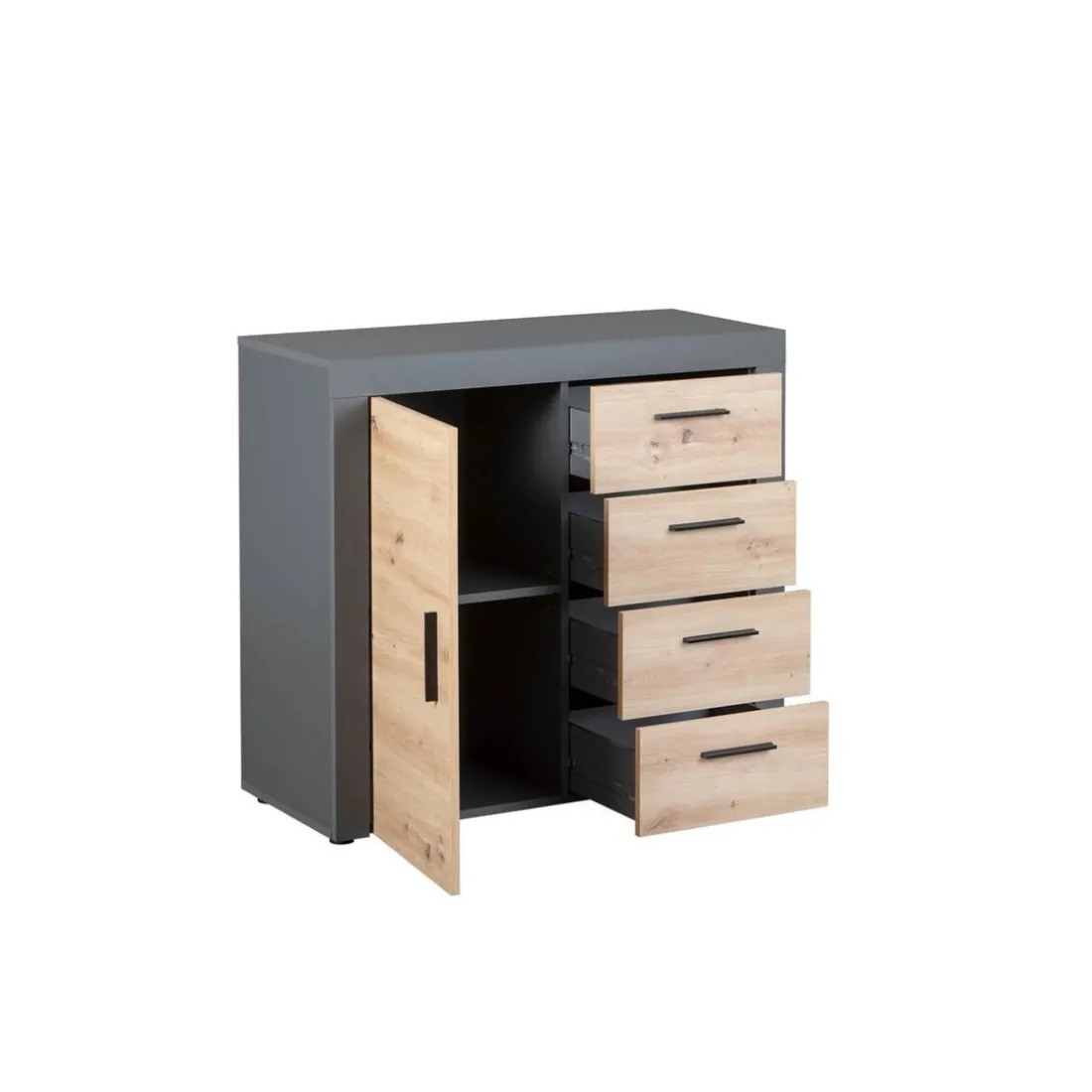 Optez pour cette commode CORBETTO 1T4S Artisan anthracite pour égayer votre salle de séjour ou votre bureau. Grâce à l’alliance du chêne artisan et du gris anthracite, elle est parfaite pour ajouter une touche industrielle à votre intérieur. Pratique, elle dispose de 4 tiroirs et d’une porte avec 2 niches qui vous permettent de ranger vos assiettes et vos linges de maison selon vos envies.