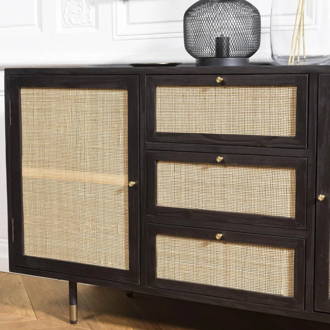 Caractéristiques Buffet Noir 2 Portes Coulissantes 1 Porte Abattante Cannage YANIS