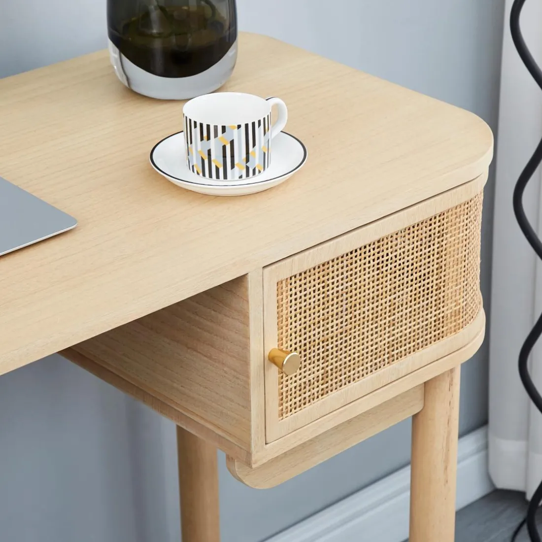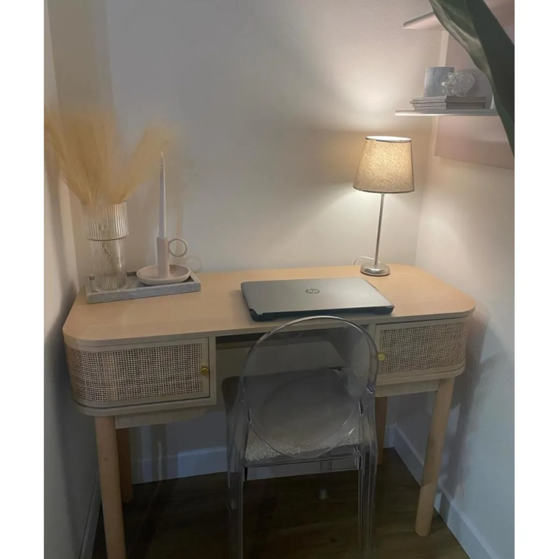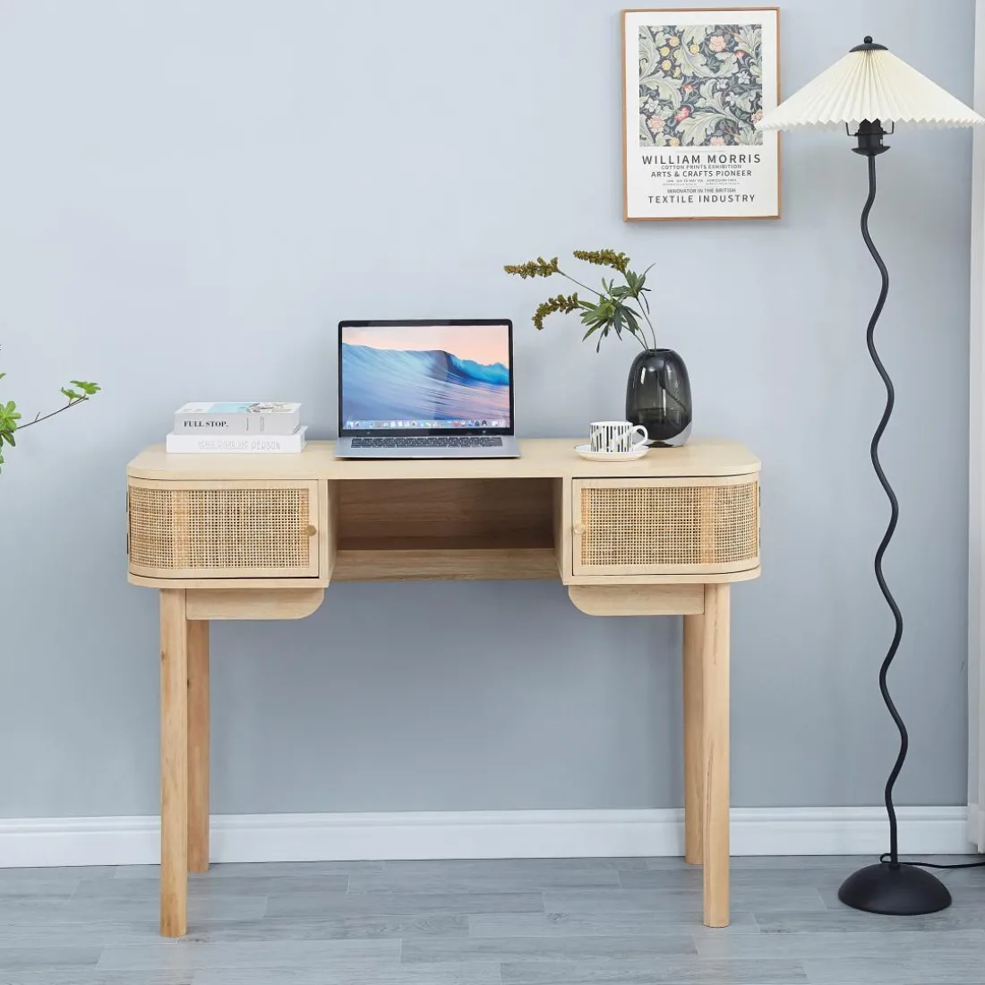 Le bureau TOYAMA, de la marque 3S. x Home, combine harmonieusement une structure en bois et un design épuré. Le bureau s’intègre parfaitement dans n’importe quelle pièce, qu’il s’agisse d’un salon, d’une chambre, ou d’une salle à manger. Deux portes coulissantes ajoutent une touche d’élégance et offrent en même temps un espace de rangement. L’effet esthétique est rehaussé par la couleur beige du bureau. Avec sa hauteur de 80 cm et sa longueur de 92 cm, il offre un espace de travail confortable. Le bureau est en outre conçu en rotin, lui conférant une résistance durable. D’après l’image fournie, les finitions sont soignées, avec des détails tels que des poignées discrètes et une texture gracieuse qui met en valeur le bois naturel.
