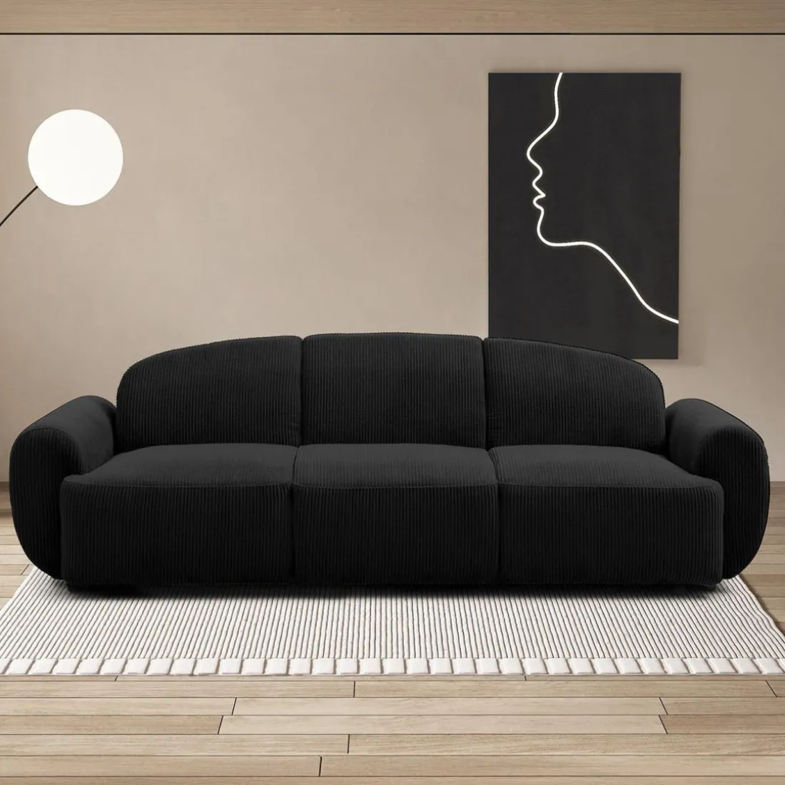 Caractéristiques Canapé 3 places convertible dossier et accoudoirs arrondis Oliver Velours côtelé Noir