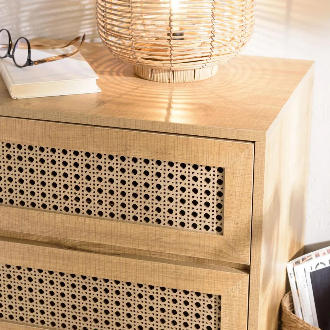 Découvrez ce Chevet marron 2 tiroirs effet cannage pieds métal noir CHARLIE, un meuble élégant et chic pour embellir toutes les chambres. Tendance, il séduit avec ses lignes nordiques et ses rotins magnifiques travaillés qui lui donnent un côté ethnique. Avec ses tiroirs de rangement pratiques, il peut accueillir facilement divers objets.