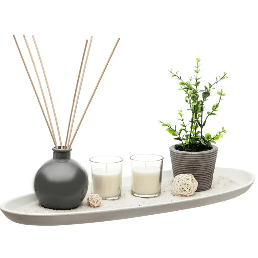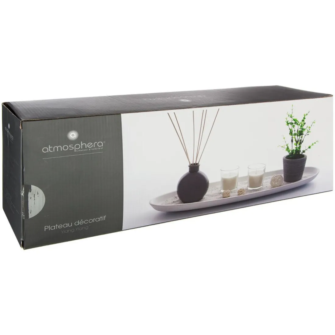 Détail Dimensions : Plateau : L. 51,5 x l. 18 x H. 3,2 cm / Diffuseur : D. 8 x H. 10 cm / Bâtons diffuseurs : H. 29 cm / Bougies : D. 5,5 x H. 6,7 cm / Pot fleur artficielle : D. 8 x H. 7,5 cm