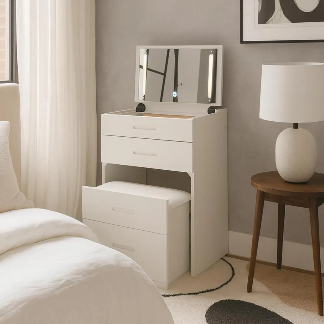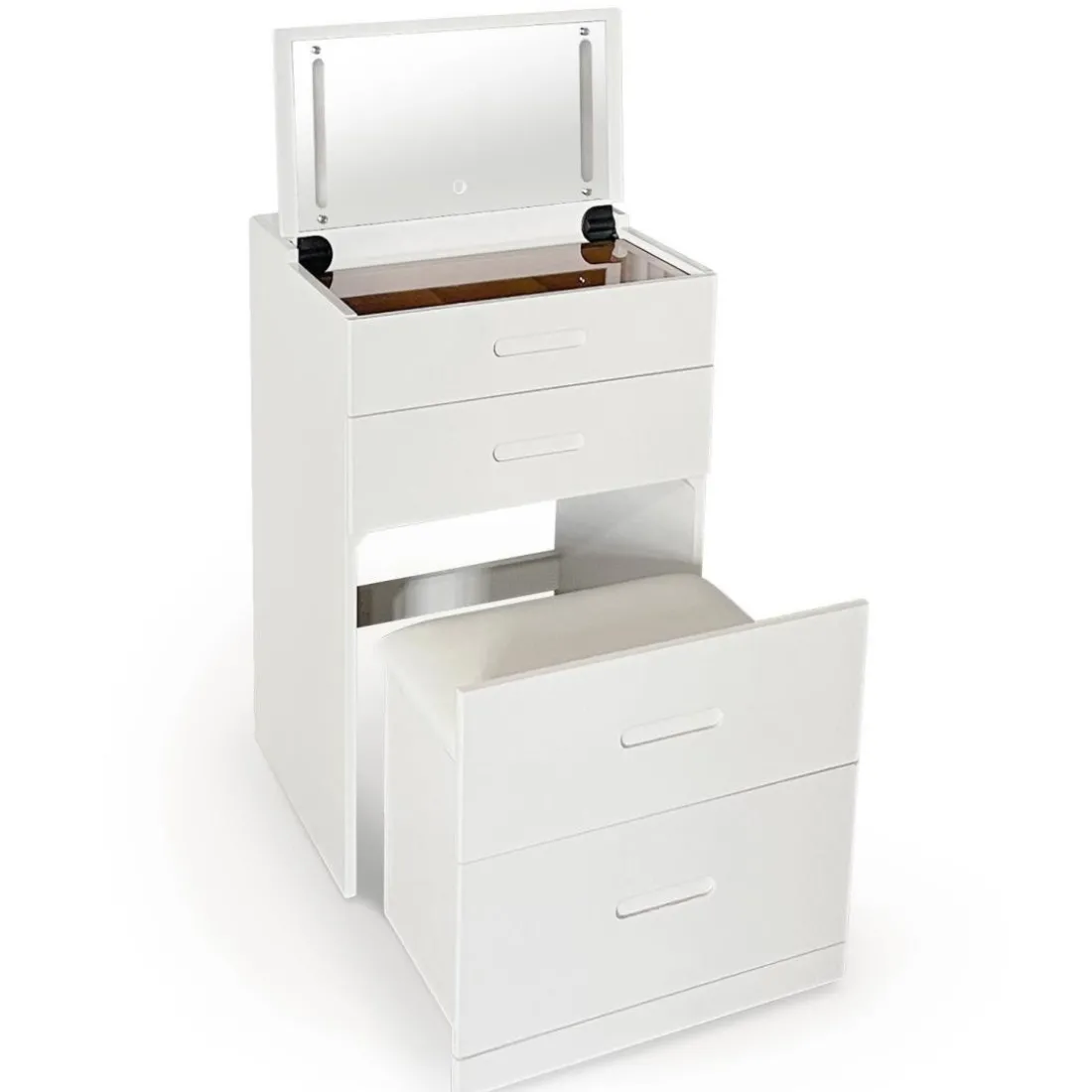 Caractéristiques Coiffeuse compacte avec miroir LED, tiroir et pouf intégré Germina Blanc