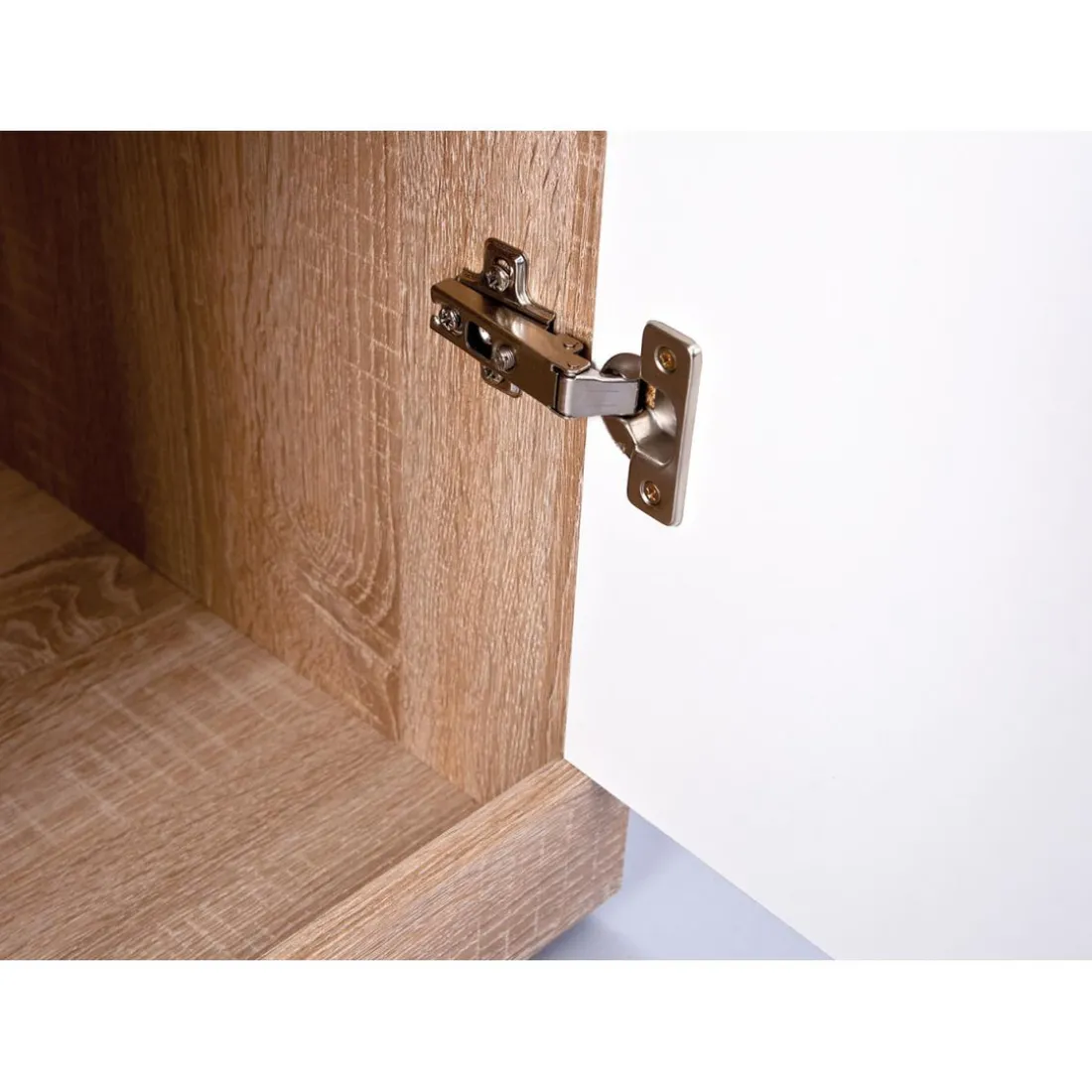 Commode DALAI moderne de couleur chêne-sonoma avec une façade blanche. Panneaux de particules mélaminé. Grande capacité de rangement grâce aux 4 tiroirs et 2 portes. Avec 2 étagères intérieures ajustables.