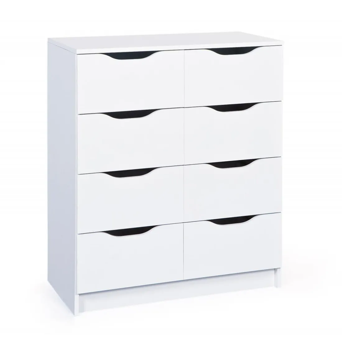 La gamme MAURATI est composée de plusieurs commodes en panneaux de particules mélaminé robuste blanc. Entretien facile et durable. Encoches pratiques à l’avant du tiroir. Avec 8 tiroirs coulissants.