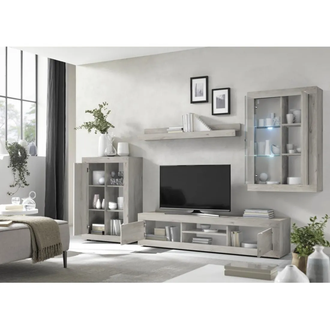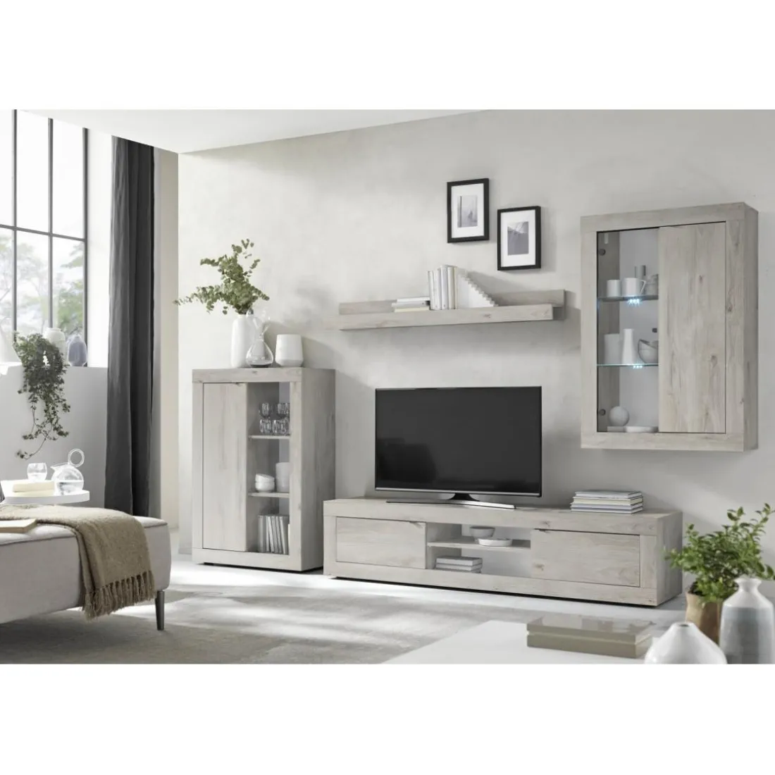Caractéristiques Composition murale meuble TV, étagère et 2 buffets muraux blanc chêne