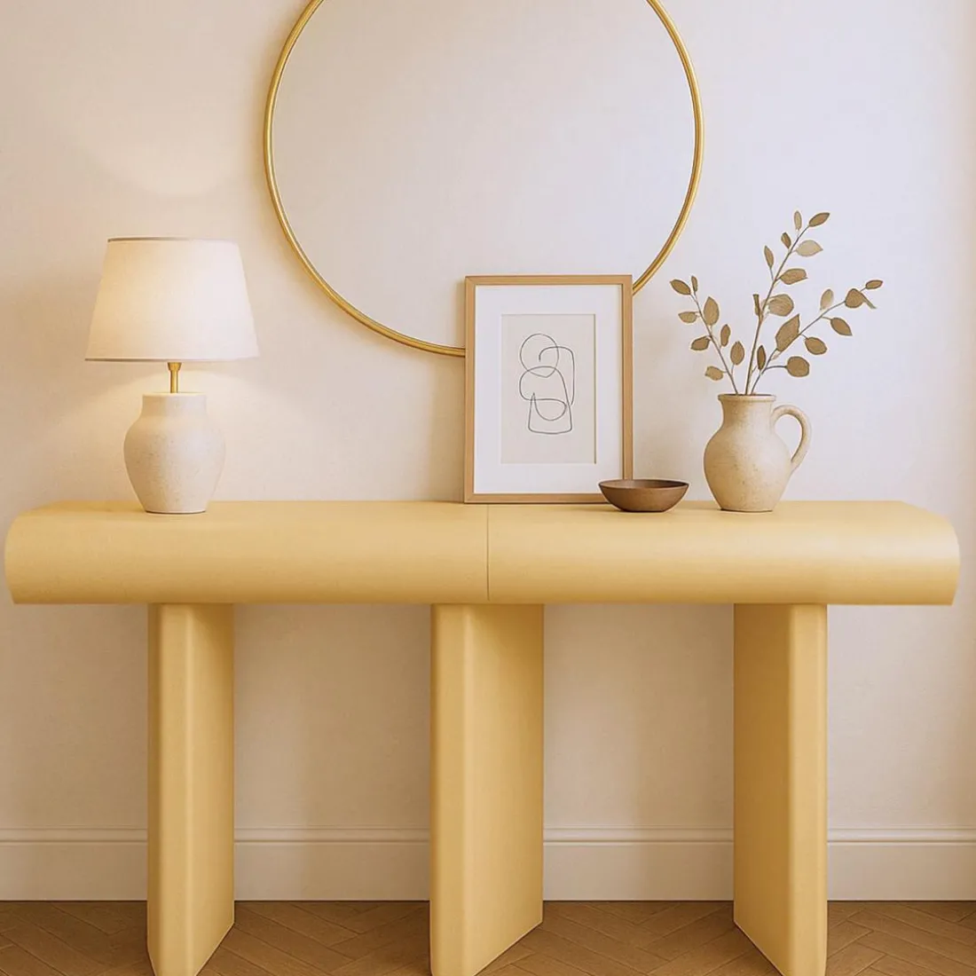 La console design 2 tiroirs avec pieds obliques Mezade de la marque 3S. x Home est l’incarnation du style authentique. Sa couleur beige apporte une sensation chaleureuse et apaisante, qui se marie bien avec ses pieds obliques pour un total équilibre. Réalisée en contreplaqué (MDF), cette console mesure 75 cm de hauteur et 121 cm de longueur, une taille idéale pour intégrer aisément votre espace de vie sans le surcharger. Les deux tiroirs offrent un rangement supplémentaire, tandis que la surface lisse est parfaite pour exposer vos objets décoratifs favoris.
