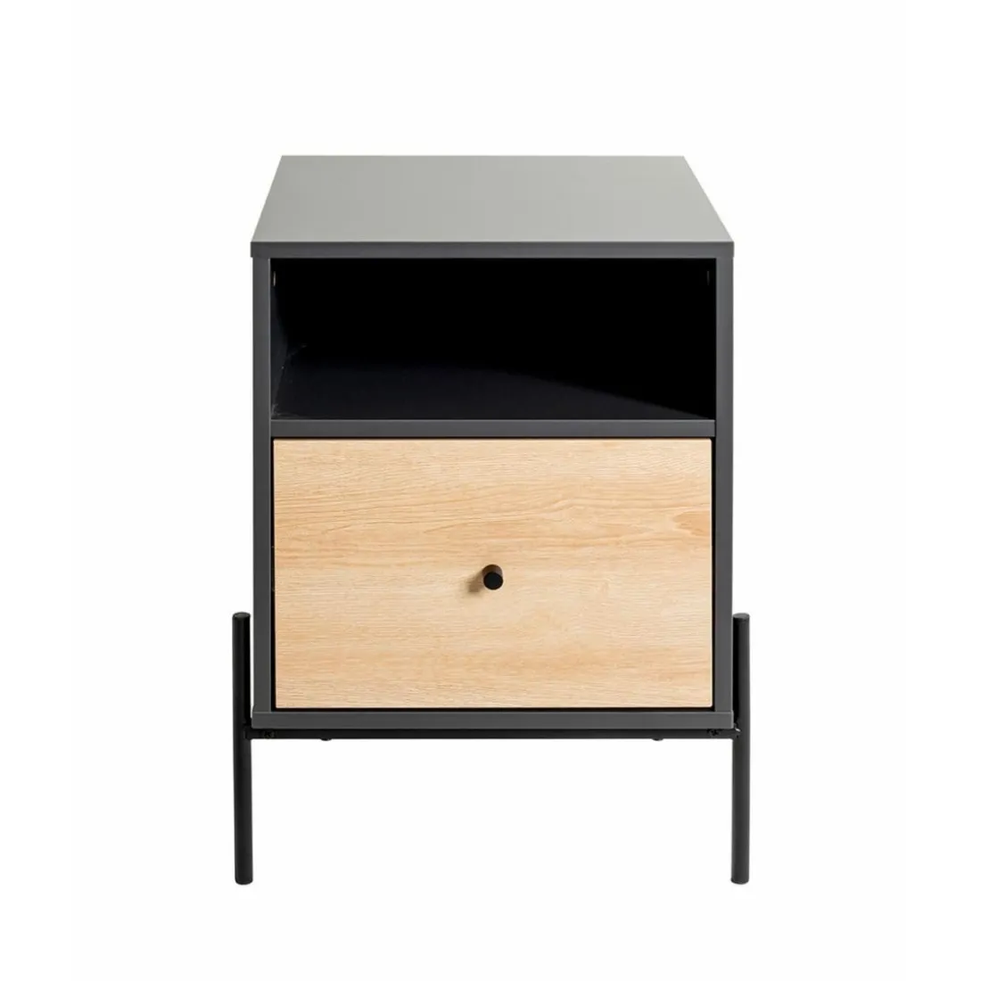 Caractéristiques Console en tube d ‘acier peint en noir par poudrage corps en MDF décor chêne naturel