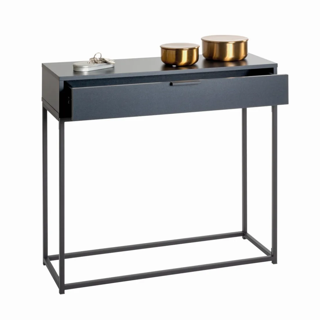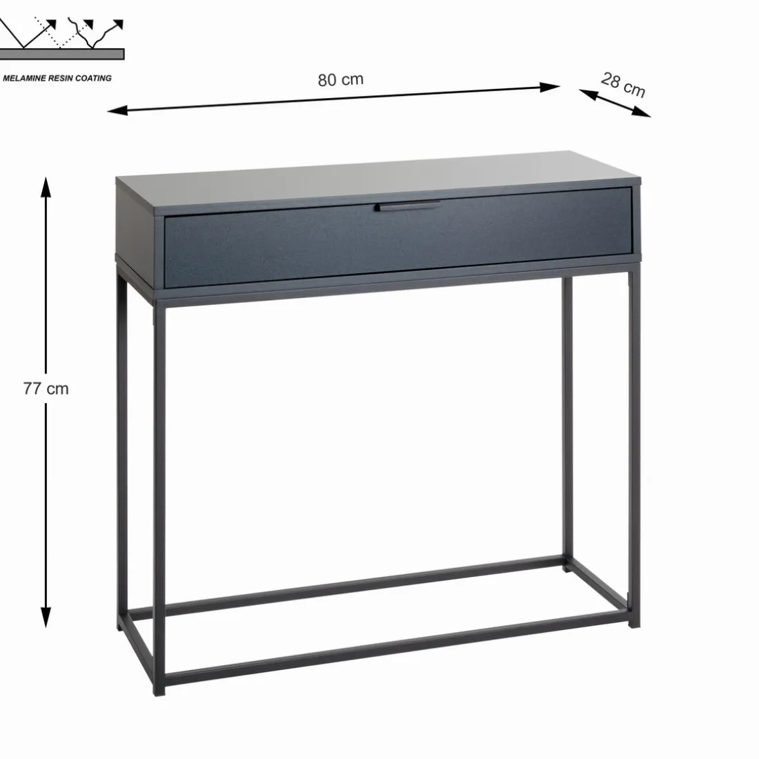 La console 3S. x Home trouve son authentique charme dans la simplicité de sa structure. Avec une hauteur de 77 cm et une longueur de 80 cm, son design sobre et épuré est mis en exergue par son tube d’acier peint par poudrage en noir. Le corps et le tiroir, réalisés en panneau de particules, ajoute une touche de modernité à cette pièce d’ameublement. La qualité de sa fabrication et la promesse d’une durabilité sont soulignées par le matériau métallique utilisé. Ses détails délicats sont visibles à travers l’image fournie, accentuant l’élégance de la console.