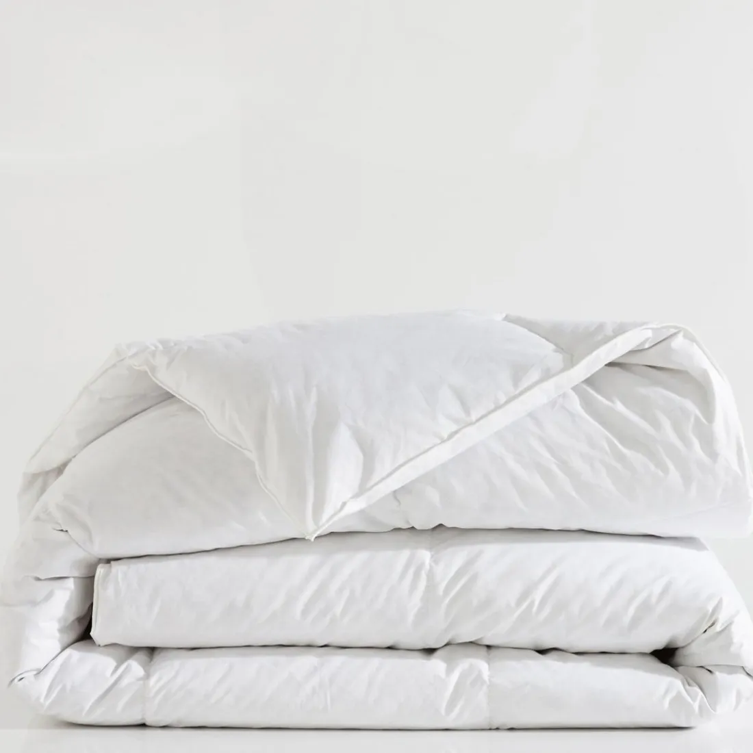 Une couette légère 50% duvet de canard avec enveloppe 100% coton percale.