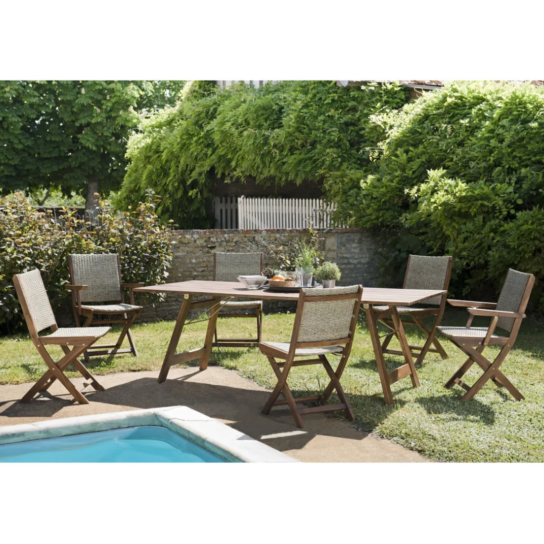 Caractéristiques Ensemble Table rectangulaire pliante + 4 chaises pliantes + 2 fauteuils pliants – Bois d’Acacia ZANZIBAR