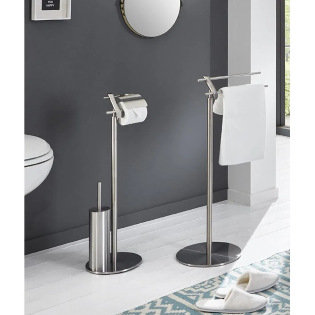 Structure en inox avec porte papier et brosse intégrée, pied en inox massif