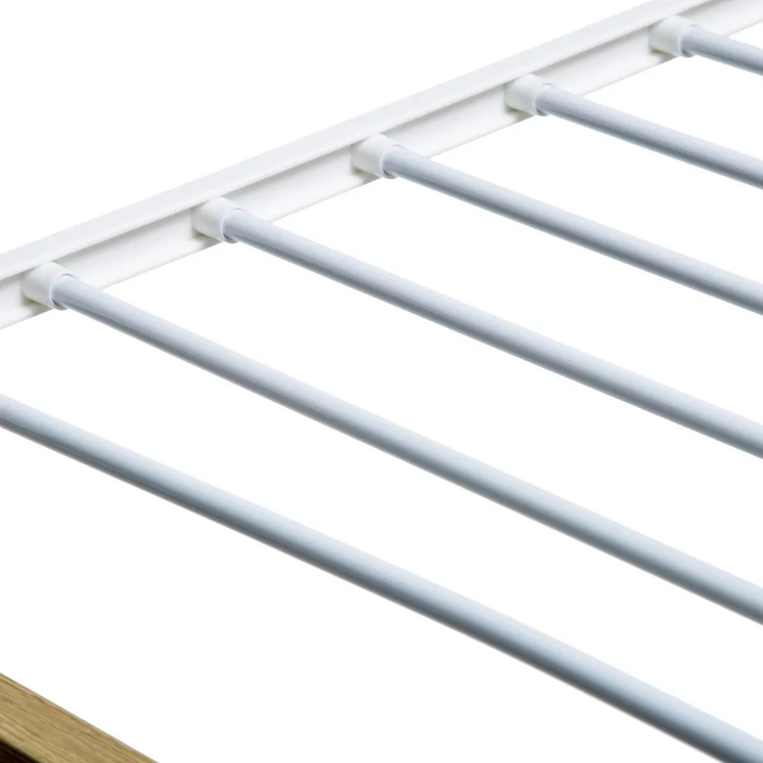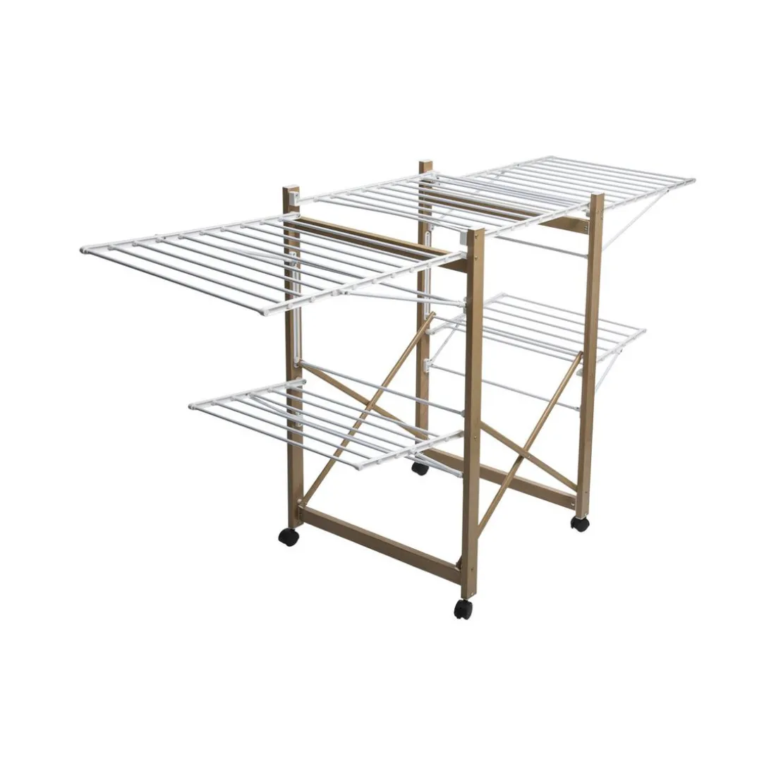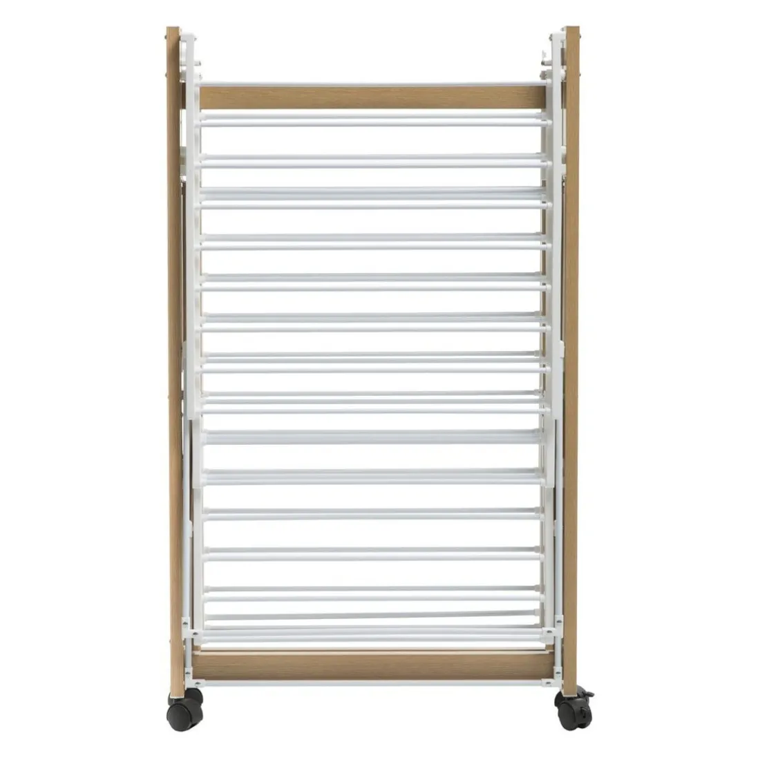 Repliable et équipé d’un piétement à roulettes, cet Étendoir 27 M Effet Bois 4 Roues se veut plus pratique que jamais. Il allie une structure en bois à des barres d’étendage en métal.