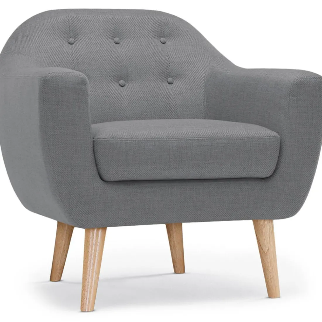 Le Fauteuil Scandinave Tissu Gris OLAF se logera dans votre séjour aux accents scandinaves, avec son assise en tissu et son piètement en bois. Vous pourrez ajouter un coussin coloré et un plaid pour rendre ce fauteuil encore plus confortable.