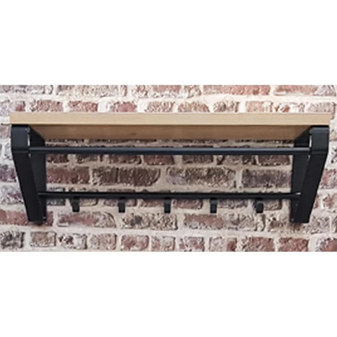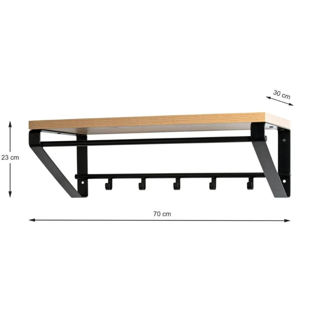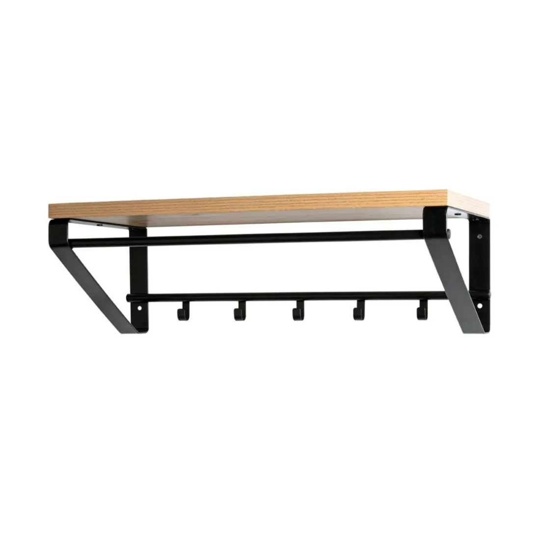 Métal laqué noir, plateau en MDF décor chêne, avec 5 crochets et 1 tringle
