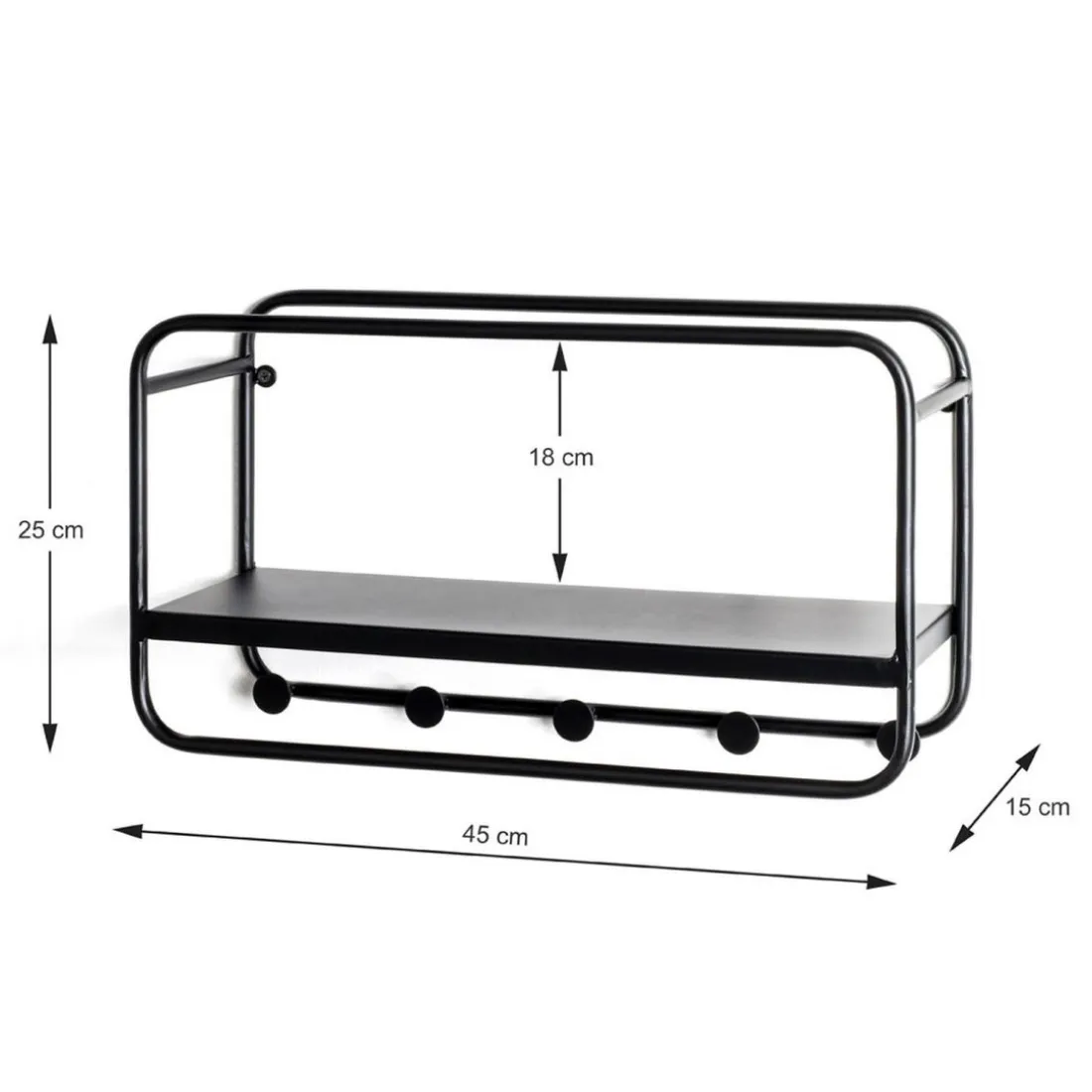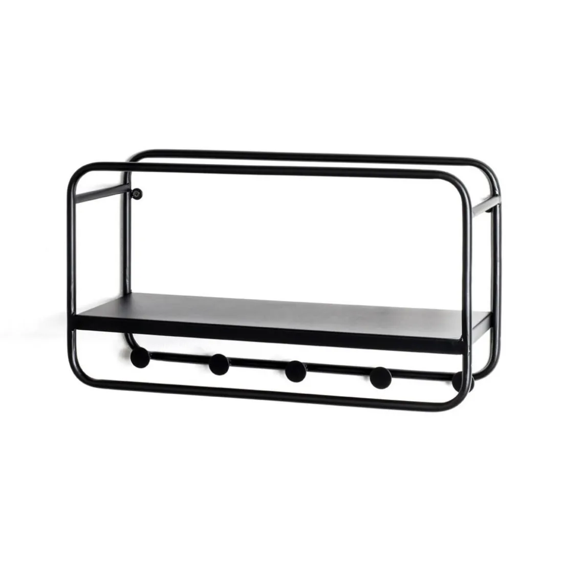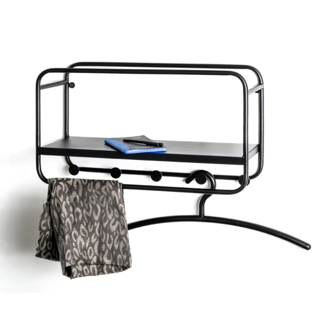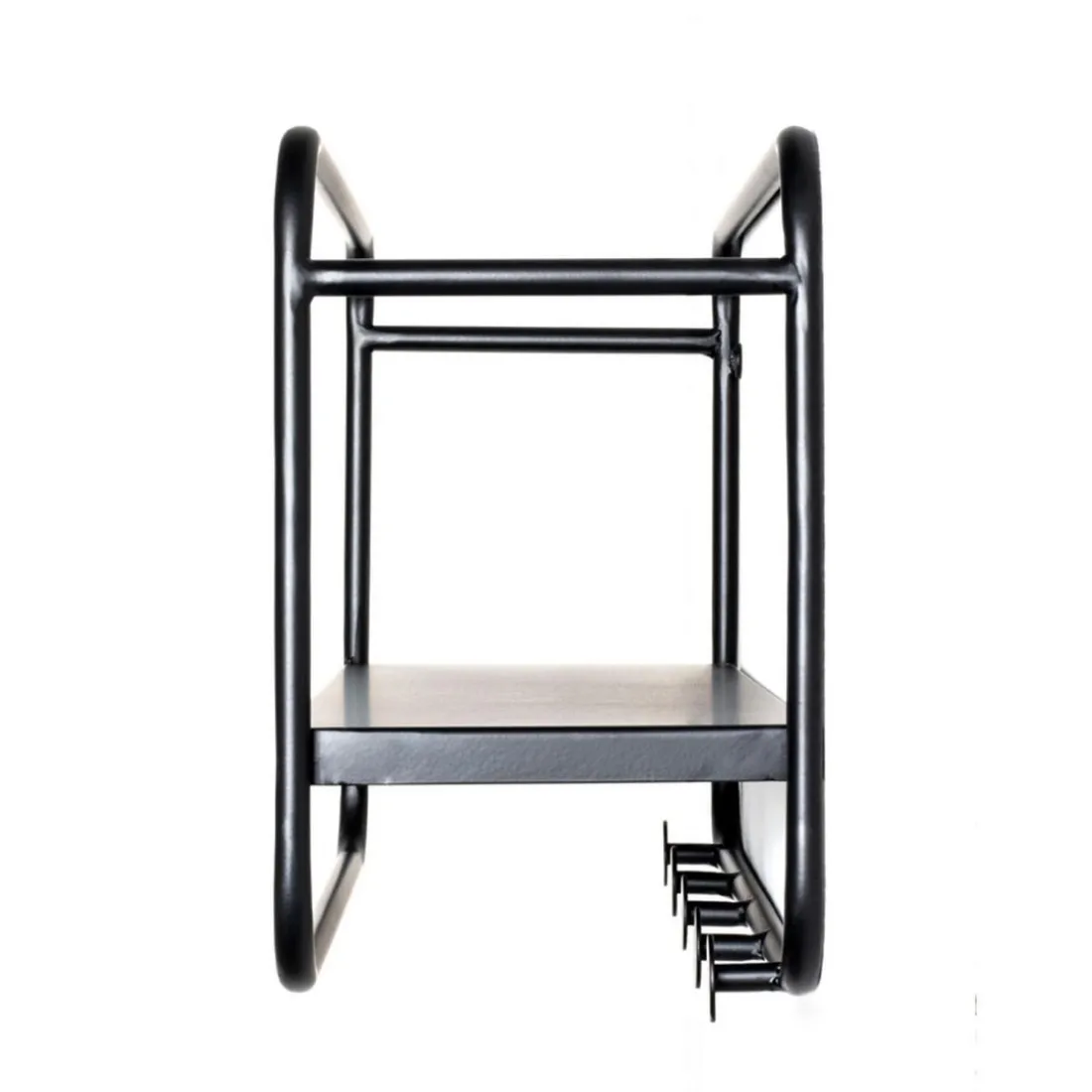 en tube d’acier laqué noir, tablette en métal laqué noir, avec 5 crochets, monté
