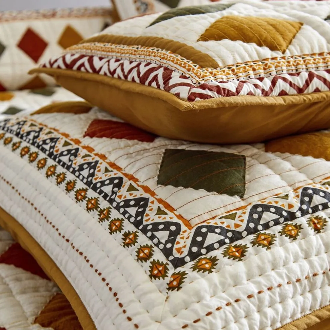 Apportez chaleur et authenticité à votre intérieur avec la housse de coussin ADANA Becquet boutis ethnique en orange poterie, une nuance inspirée des terres cuites artisanales. Confectionnée en 100% coton avec garnissage 100% polyester, elle se distingue par ses applications de losanges multicolores dans des tons rouge, vert profond, curry et terracotta, délicatement disposés sur un fond clair texturé. Des lignes de broderies contrastantes et des broderies carrées faites main viennent souligner chaque motif pour un rendu artisanal raffiné. Son parement imprimé ethnique en entourage, dans des tons assortis, est rehaussé de broderies kantha en gros points faites main qui ajoutent du relief. Le dos uni coloris camel et la fermeture par nouettes complètent ce modèle élégant. Lavable à 30°, elle est parfaite pour un canapé, un fauteuil ou comme élément décoratif sur un lit.