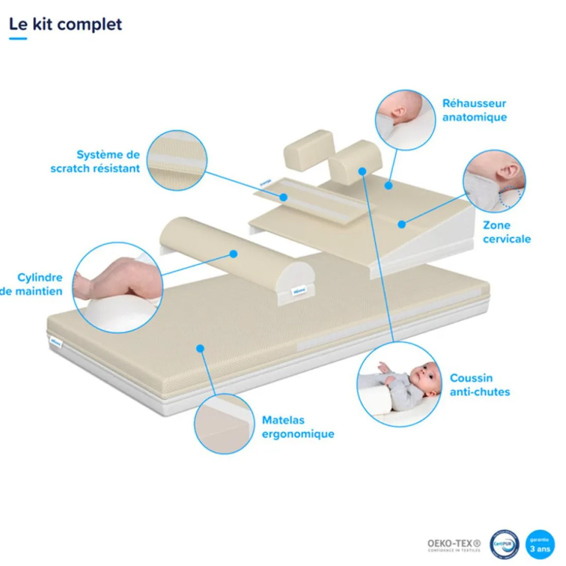 Le matelas Minea offre un accueil moelleux et un soutien medium. Il est composé de mousse Haute Densité pour un bon soutien du corps, d’une housse réversible avec faces été/hiver et d’un kit d’accessoires élaborés pour garantir à bébé une bonne position lorsqu’il est à vos côtés (à retirer pour les siestes et la nuit).