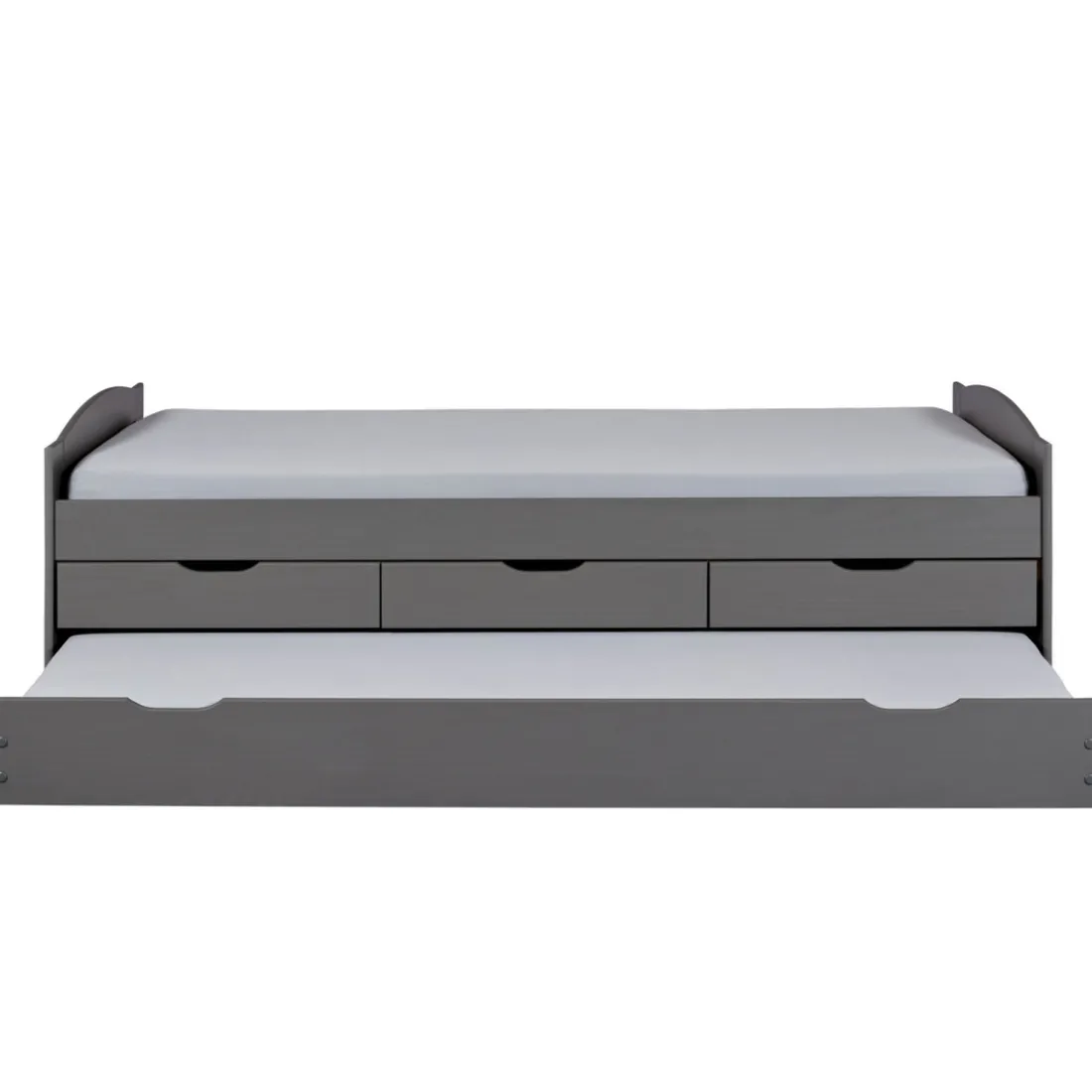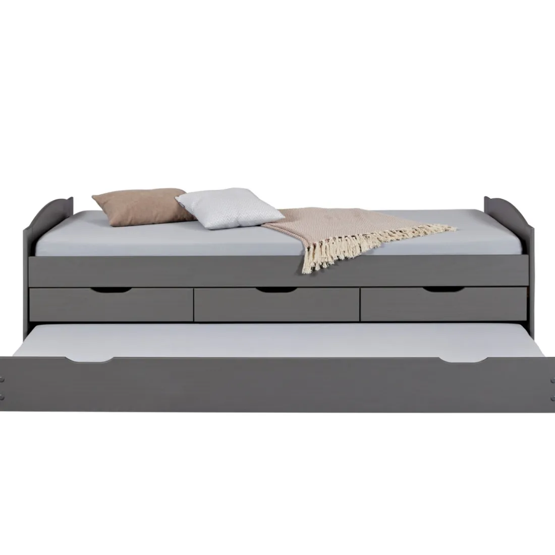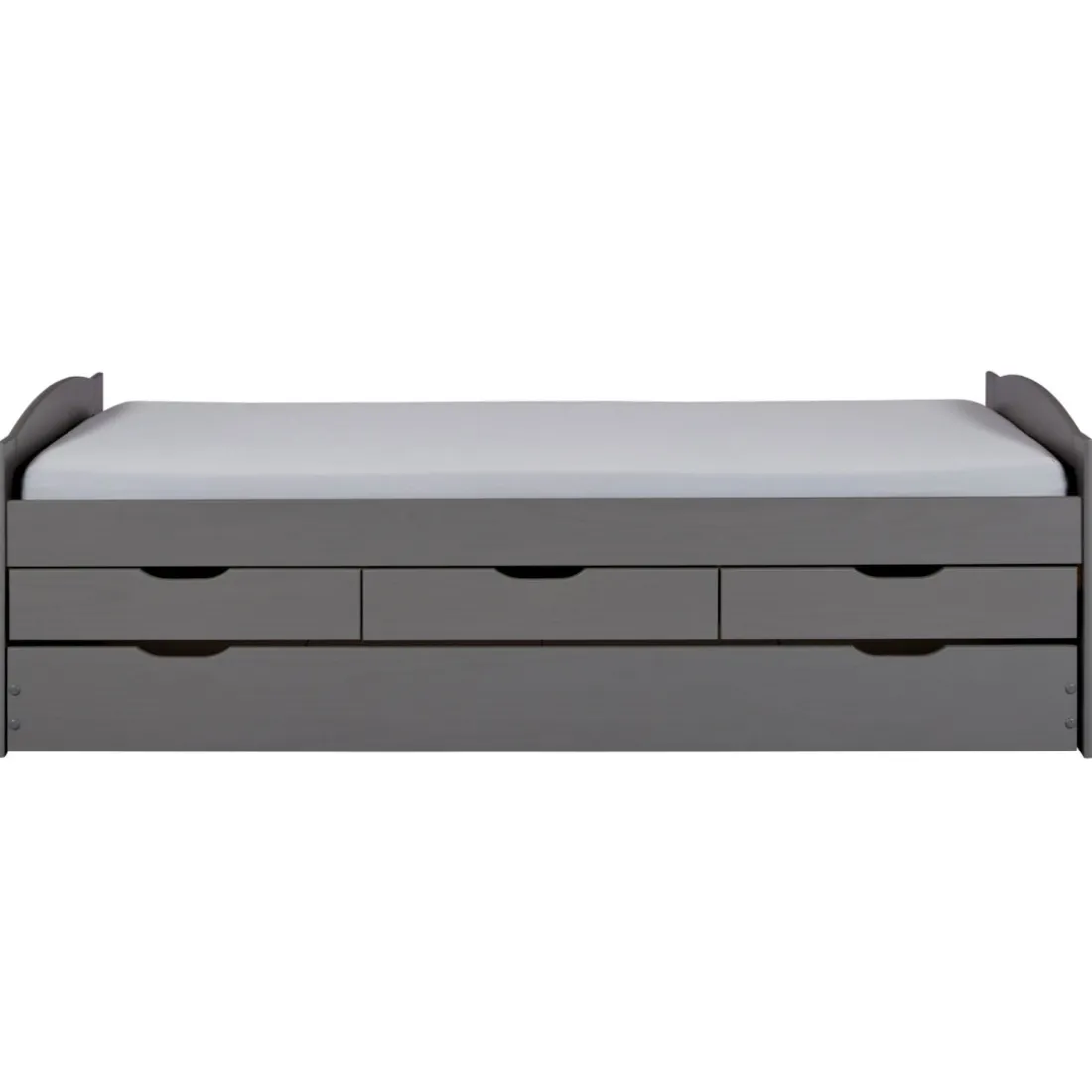 Optimisez vos rangements et votre espace en vous offrant ce Lit à Tiroirs 90x200cm Gris en Pin Massif Laqué LENA. Grâce à ses trois tiroirs fonctionnels, il vous offre plusieurs possibilités d’organisation. Son compartiment inférieur sur roulettes peut se transformer en couchage supplémentaire, faisant de lui un mobilier pratique au design épuré. La sobriété de son coloris en fait un idéal dans tout style d’intérieur.