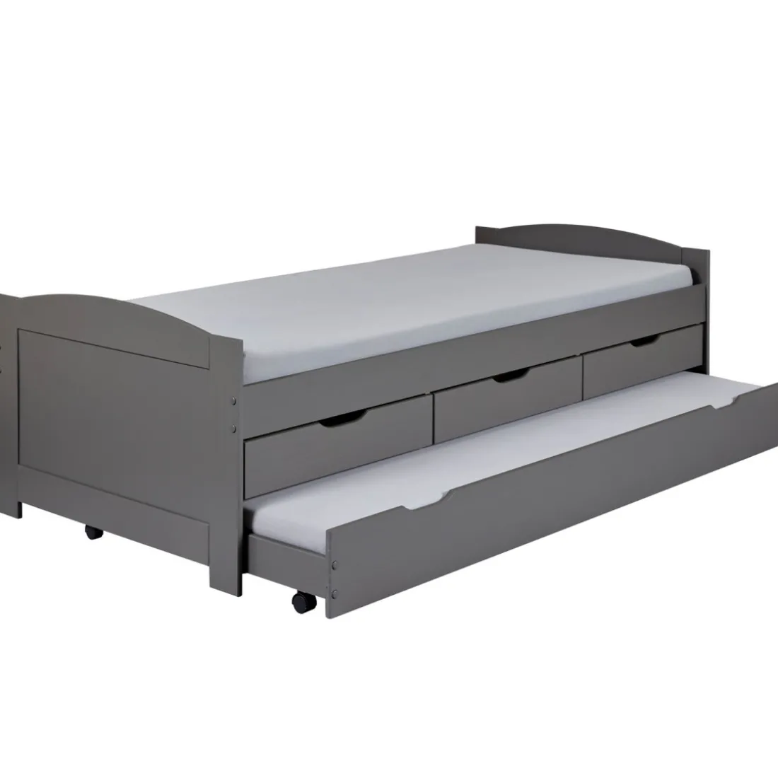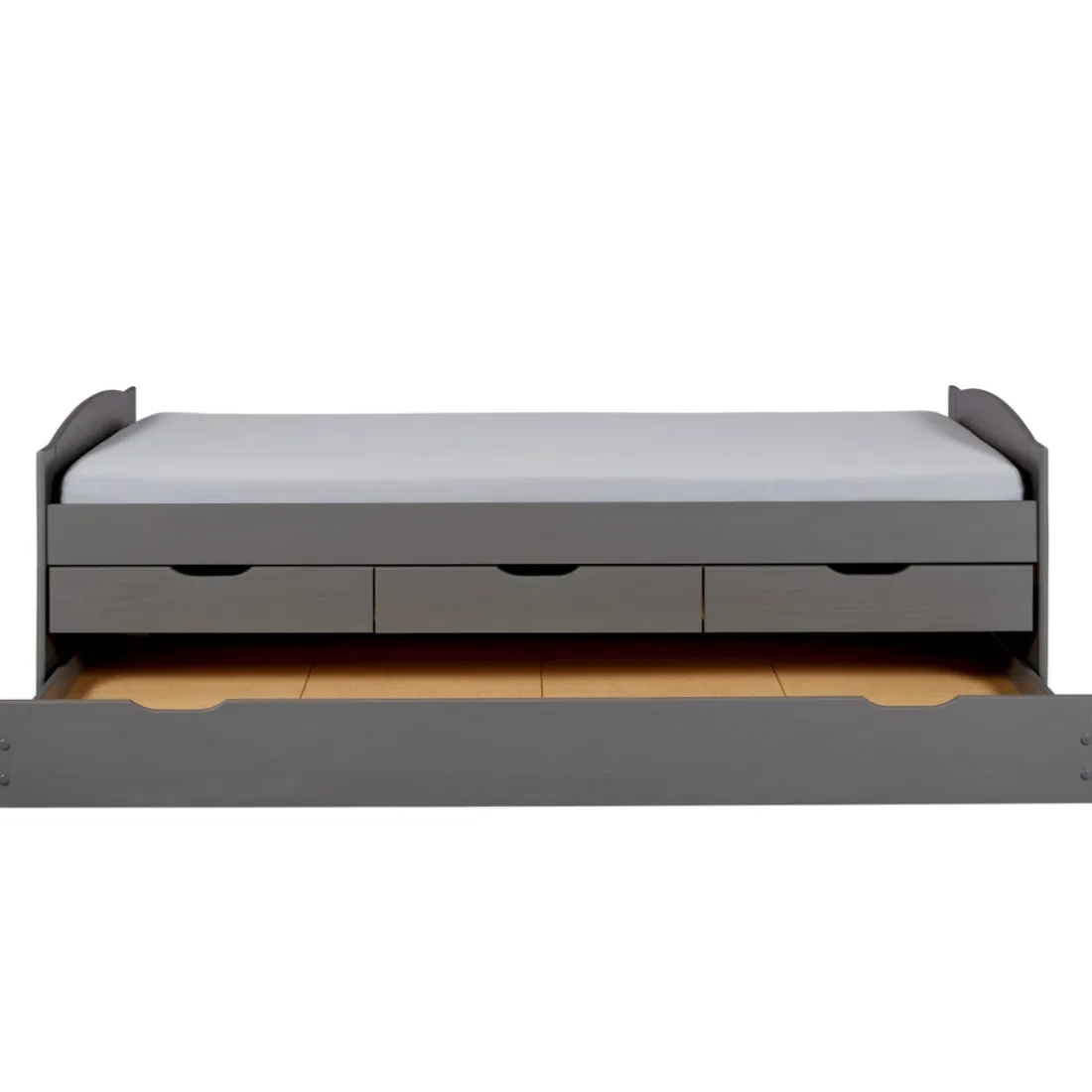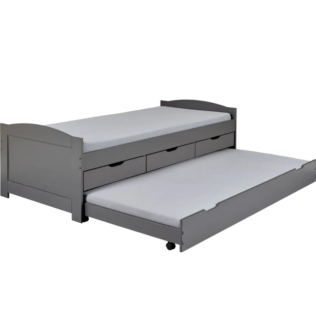 Optimisez vos rangements et votre espace en vous offrant ce Lit à Tiroirs 90x200cm Gris en Pin Massif Laqué LENA. Grâce à ses trois tiroirs fonctionnels, il vous offre plusieurs possibilités d’organisation. Son compartiment inférieur sur roulettes peut se transformer en couchage supplémentaire, faisant de lui un mobilier pratique au design épuré. La sobriété de son coloris en fait un idéal dans tout style d’intérieur.
