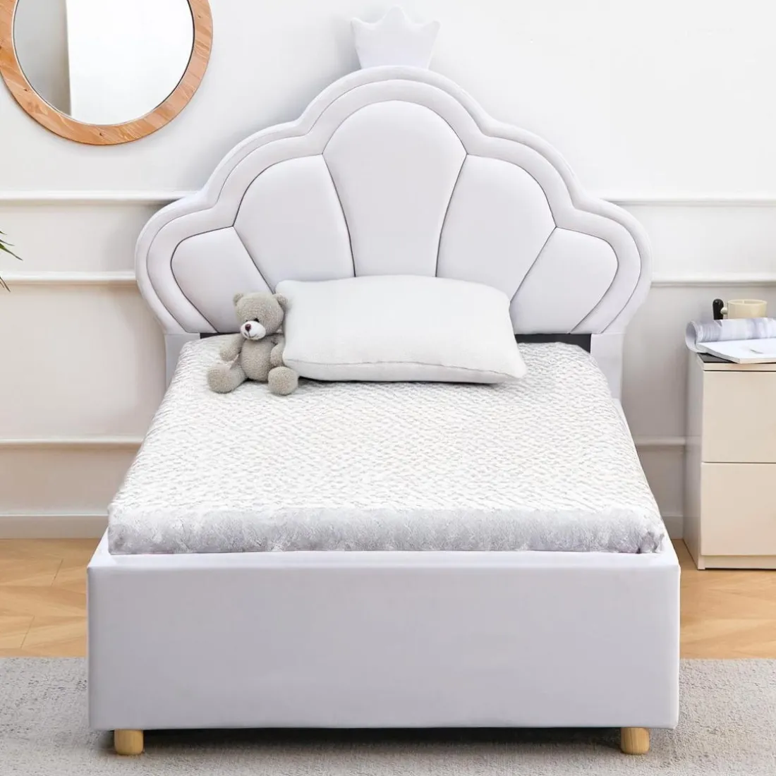 Caractéristiques Lit simple avec tête de lit coquillage et sommier relevable Queenie Simili Blanc