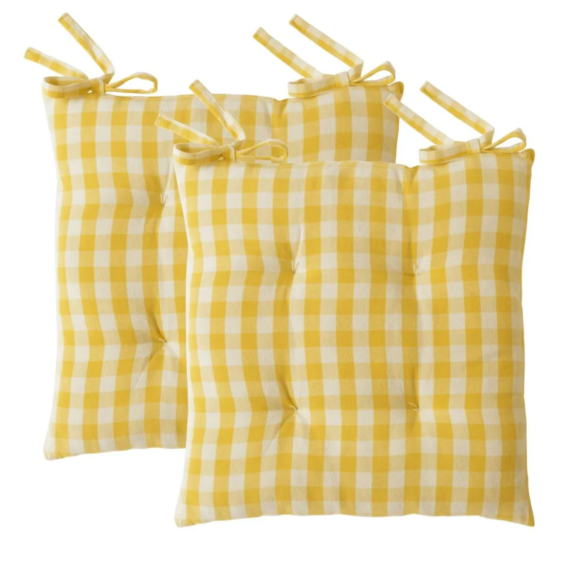 Redonnez du style et du confort à vos sièges avec ce lot de deux galettes de chaise VICHY jaune de Becquet. Leur motif à carreaux Vichy apporte une ambiance conviviale et rétro à votre déco. Conçues en 100% coton tissé jacquard avec un garnissage 100% coton, elles sont à la fois épaisses et moelleuses pour un confort optimal. Leur piquage quatre points capitons renforce leur tenue et leur esthétique. Faciles à installer grâce à leurs liens à nouer, elles restent bien en place. Dimensions : 40 x 40 cm, épaisseur 4 cm. Idéales pour une déco tendance et cosy !