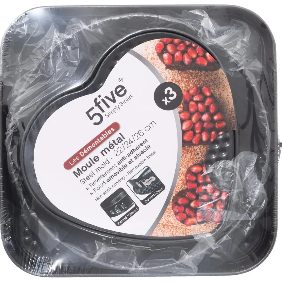 Détail Dimensions : 3 FORMES PAR SET : – 1 MOULE DEMONTABLE CARRE h. 6,7cm x L. 26CM x l. 26cm / 428g- 1 MOULE DEMONTABLE ROND h. 6,8cm x d. 24cm / 293g- 1 MOULE DEMONTABLE COEUR h. 8 x L. 22cm x l. 20cm / 292g