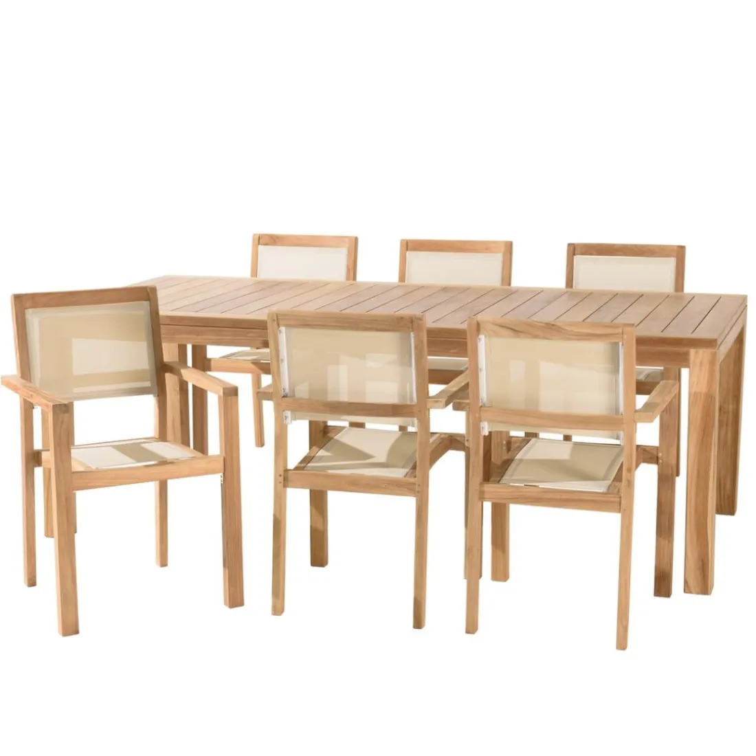 Découvrez le lot n°168, un magnifique salon de jardin de la marque MACABANE. Conçu pour accueillir jusqu’à 8 à 10 personnes, c’est le choix parfait pour organiser vos rencontres en plein air. Fabriqué en teck de haute qualité, ce salon de jardin est exceptionnellement robuste et durable. Combinant le bois de teck avec du textilène beige, ce salon de jardin est esthétiquement plaisant avec sa couleur Beige. Il comprend une table spacieuse et des chaises confortables pour passer d’agréables moments. L’image montre des détails fins sur la texture du bois et la qualité du textile.