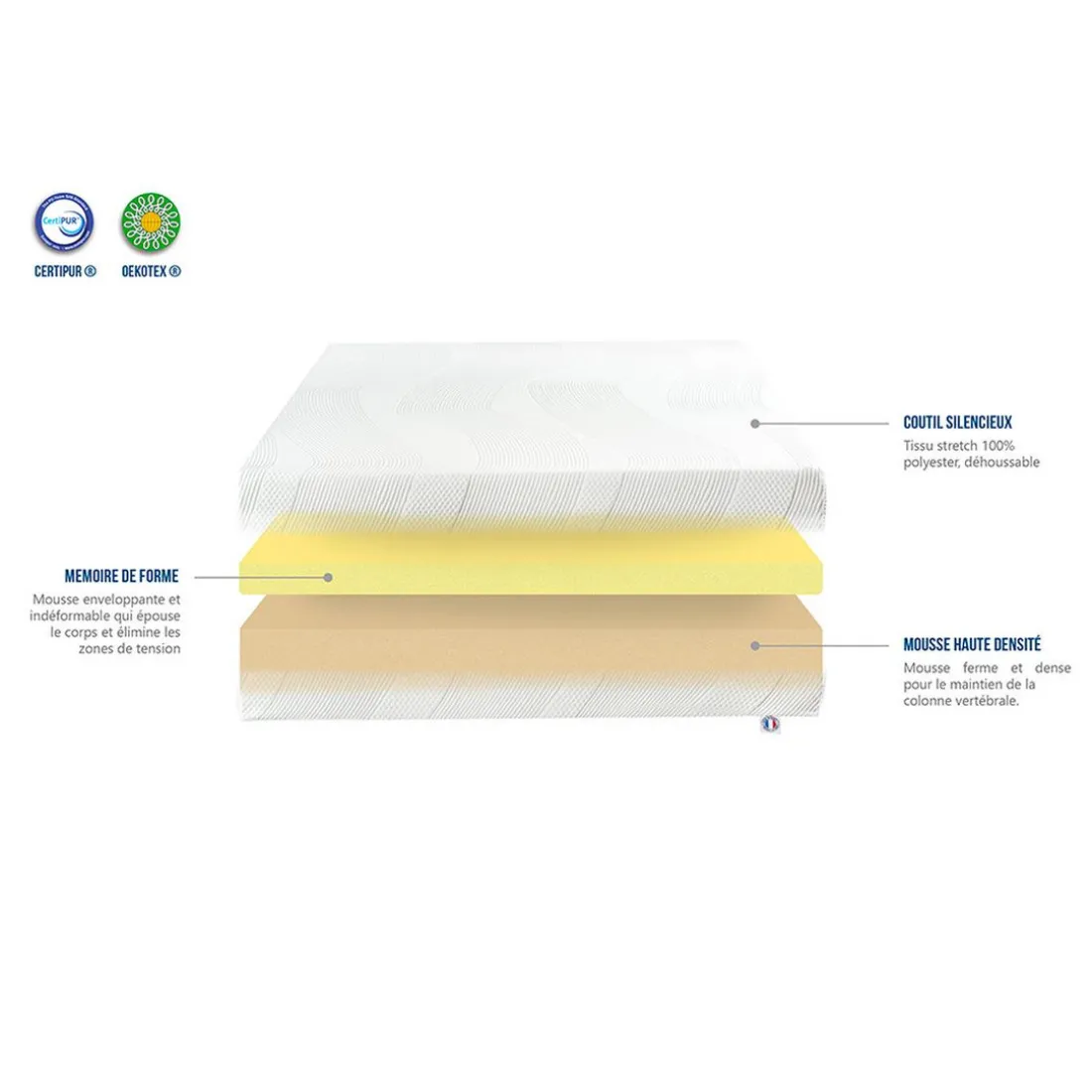 - Coutil (Tissu) : Tissu stretch 100 % PES 300 gr/m² avec face sommier antidérapante
