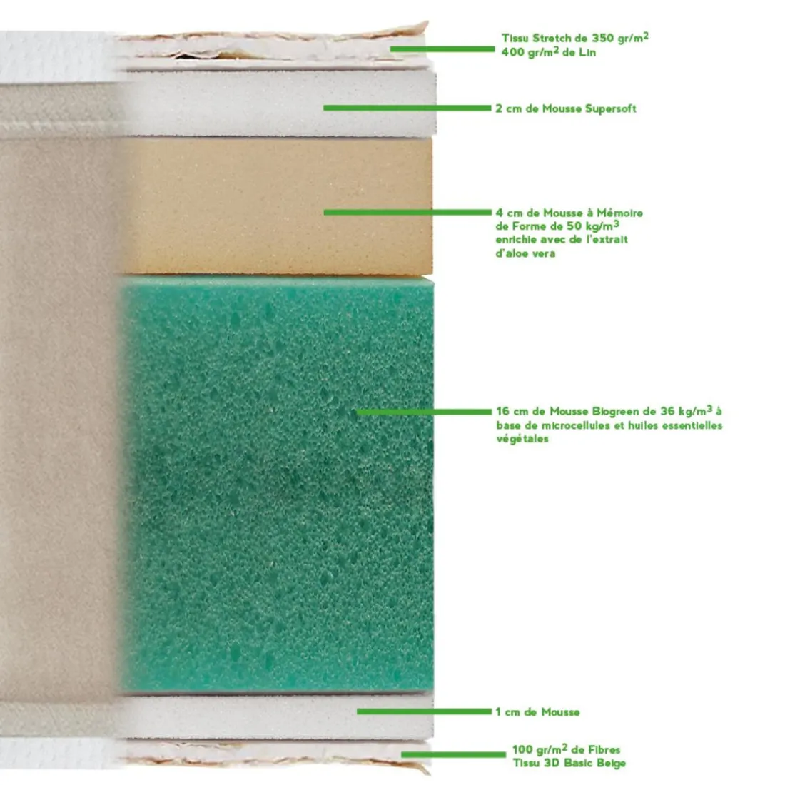 Le matelas Symphonie 2.0 offre un accueil progressif et un soutien ferme. Il contient en surface une mousse à mémoire de forme enrichie en aloe vera pour une ergonomie parfaite et en profondeur une mousse Haute Densité Biogreen à base d’huiles essentielles végétales pour un bon soutien du corps. Bien-être garanti !