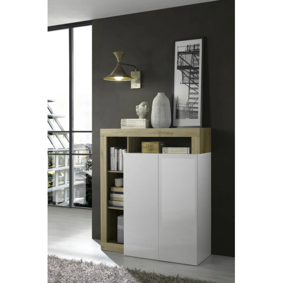 Caractéristiques Meuble bar 2 portes blanc lacqué brillant chene Cadiz