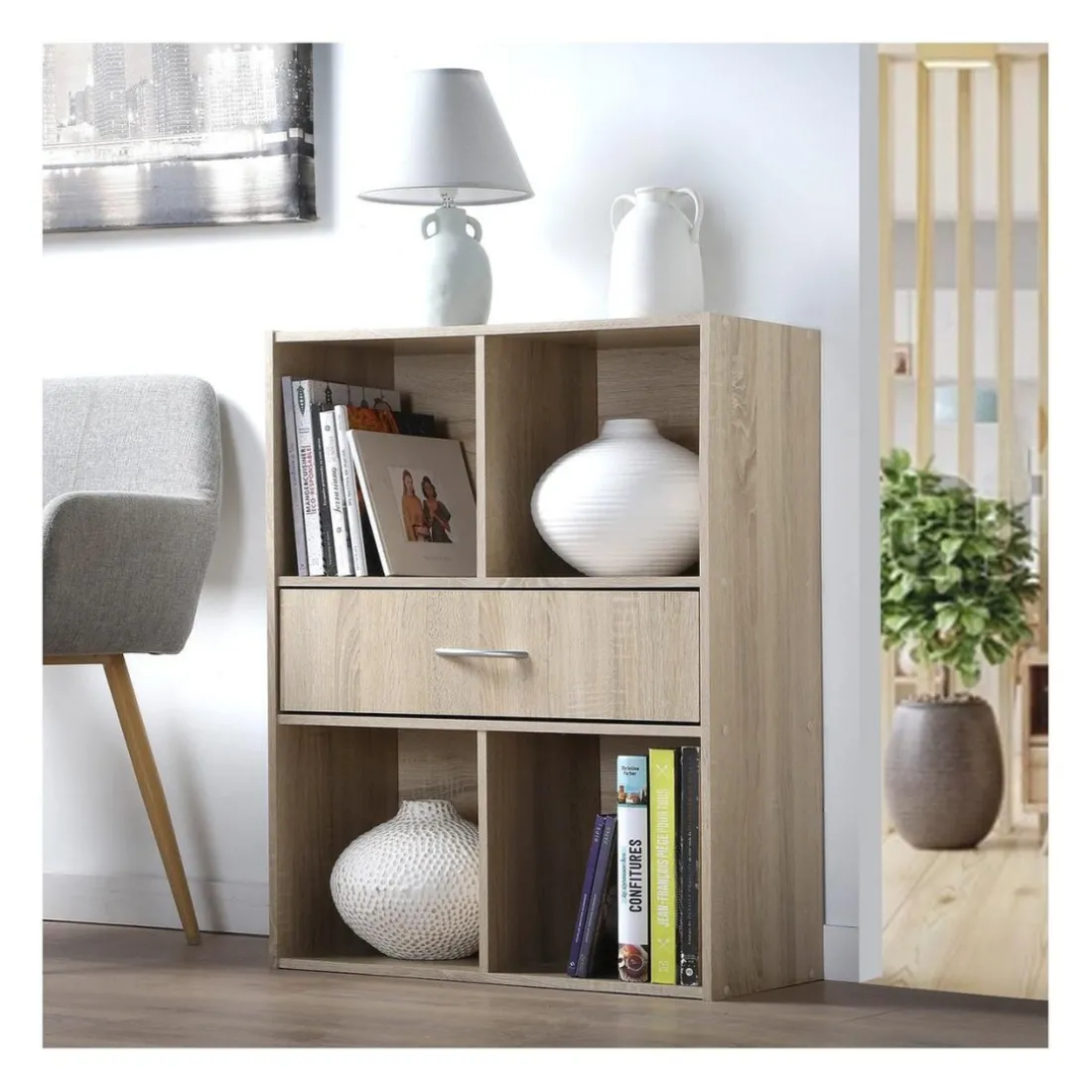 Ce meuble de rangement Calicosy combine fonctionnalité et style. Avec ses 4 cases de rangement ouvertes et un tiroir pratique pour vos effets personnels, il maximise votre espace tout en ajoutant une touche élégante à votre intérieur. Le meuble est de couleur beige, apportant une ambiance chaleureuse et relaxante. Il est fabriqué en panneau de particules, garantissant sa robustesse et sa durabilité. Son design sobre et moderne s’adaptera à tous types de décoration.