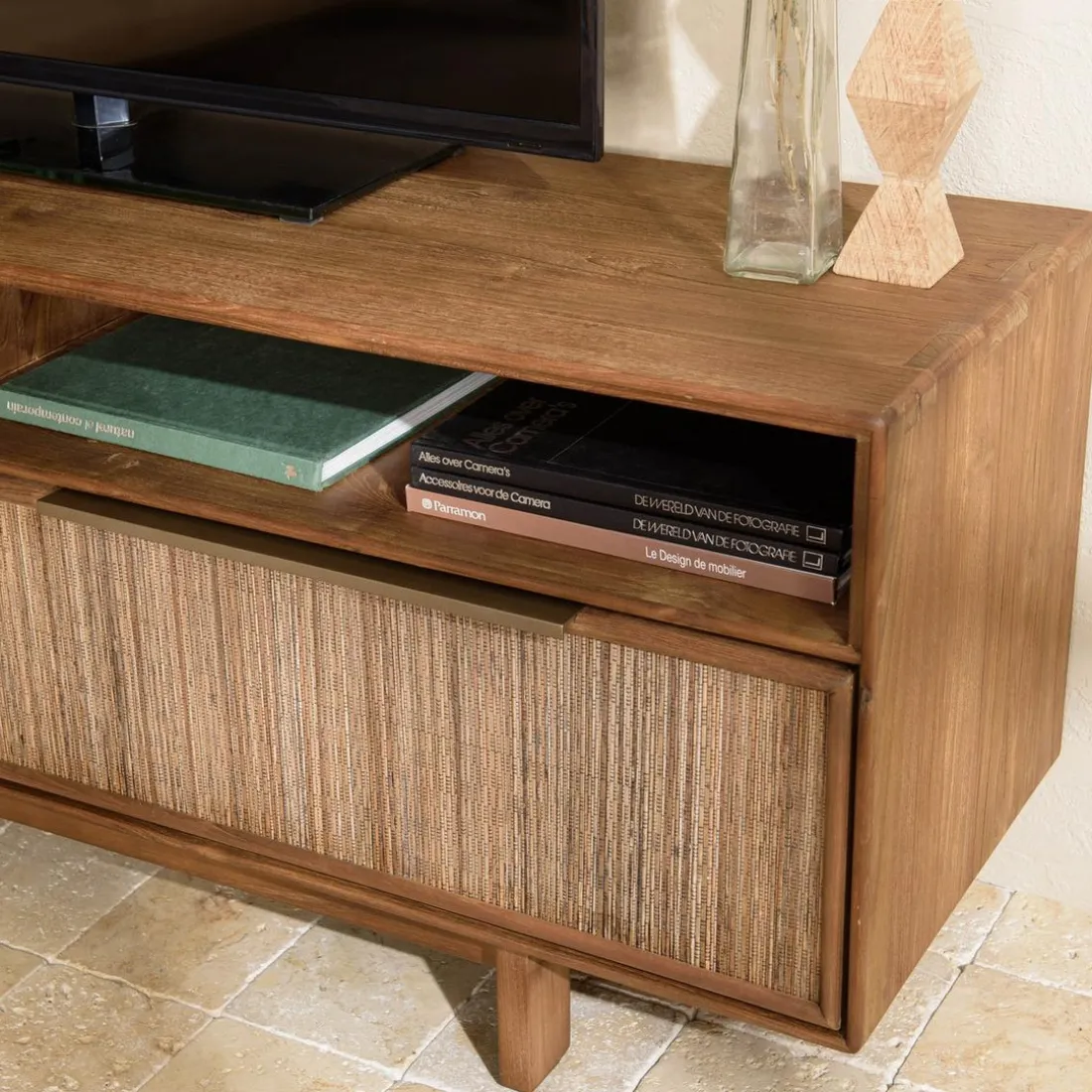 Caractéristiques Meuble TV 2 tiroirs 2 niches en bois de teck recyclé