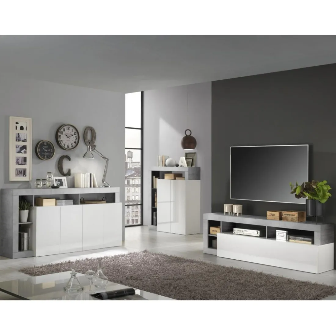 Caractéristiques Meuble TV un abattant blanc lacqué brillant béton