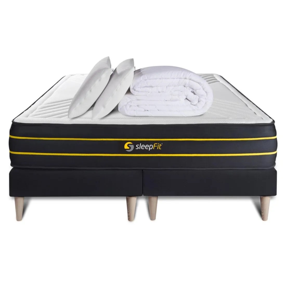 Le Pack matelas ULTRA double sommiers noir de la marque SleepFit vous offre un confort inégalé pour des nuits paisibles. Cet ensemble matelas sommiers se distingue par son élégante couleur noire, qui s’associera harmonieusement à votre décor. Il est réalisé en matière mousse, reconnue pour son soutien et son confort. Il associe mode et fonctionnalité avec son style authentique. Le pack comprend également une couette douillette et 2 oreillers confortables pour une expérience de sommeil complète. Son image montre sa qualité supérieure avec des détails bien finis et ses sommiers stables qui assurent une utilisation durable.