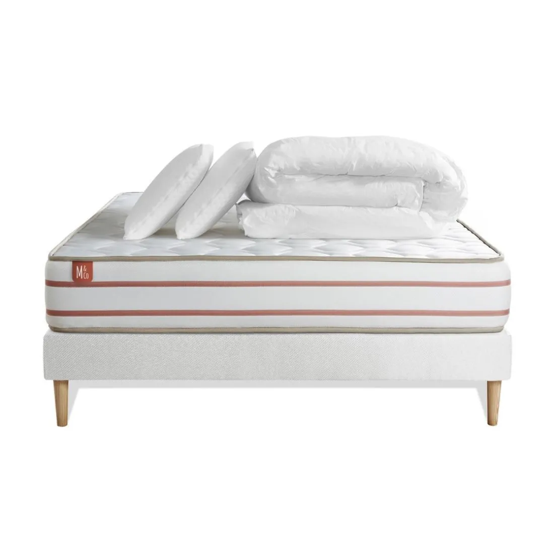 Ce superbe produit de la marque Marmottes & Co est un Pack prêt à dormir qui comprend un matelas LE DOUX Mémoire de forme, un sommier en kit, deux oreillers et une couette. La teinte blanche de l’ensemble lui confère une élégance intemporelle et s’adapte à tous les styles de chambres. Fait en tissu de grande qualité, ce pack a un style authentique qui apporte une touche chaleureuse à votre chambre. Le matelas à mémoire de forme offre un grand confort pour un sommeil de qualité. Quant au sommier, son montage en kit facilite son installation. Les détails de l’image indiquent une finition soignée et une attention particulière aux détails, reflétant le savoir-faire de la marque.
