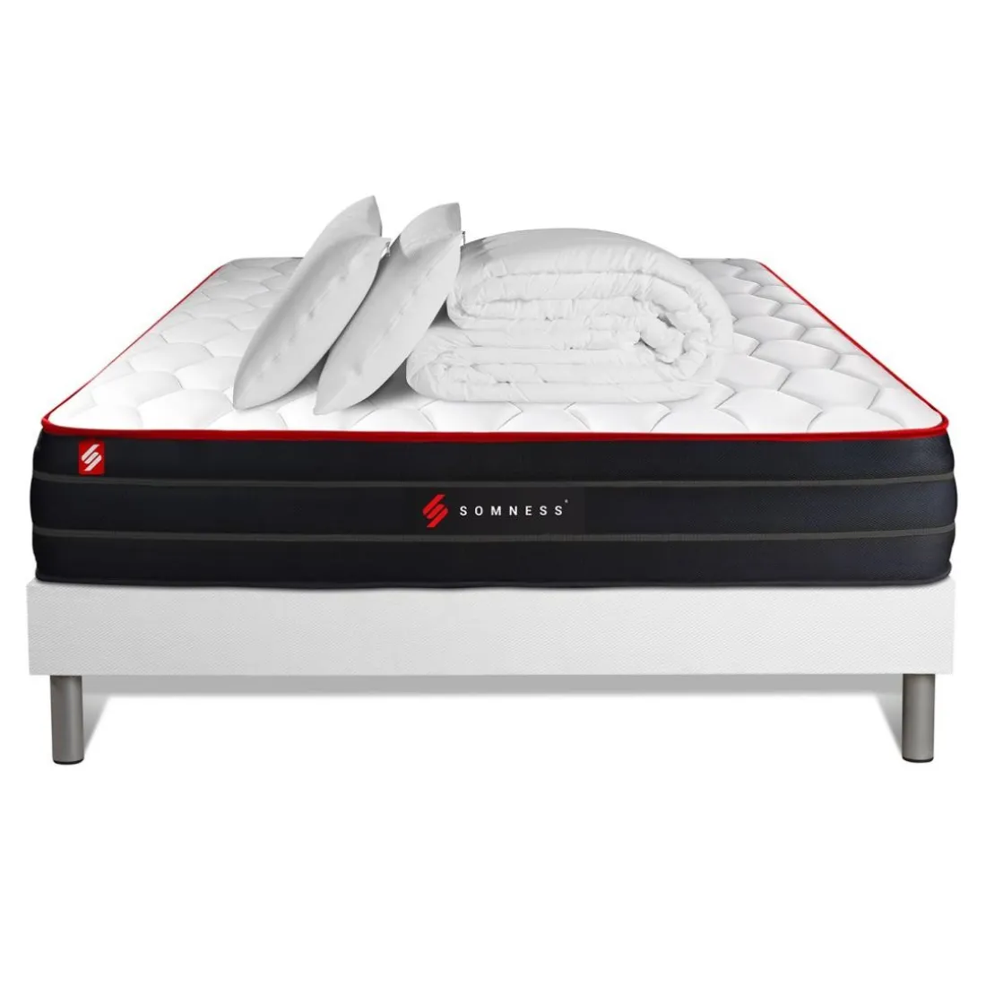Ce pack prêt à dormir de la marque Somness est un ensemble 5 en 1 incluant un matelas à ressorts ensachés et mémoire de forme, un sommier kit et deux oreillers. Sa couleur blanche ajoute une note apaisante. Il est fabriqué en tissu de haute qualité pour un confort optimal. Le sommier est facile à installer grâce à son kit. La couette intégrée vous offrira une sensation de chaleur douillette. Les oreillers en mousse à mémoire de forme épousent parfaitement la forme de votre nuque pour des nuits paisibles. Le style authentique de ce produit apporte une touche de charme à votre chambre.