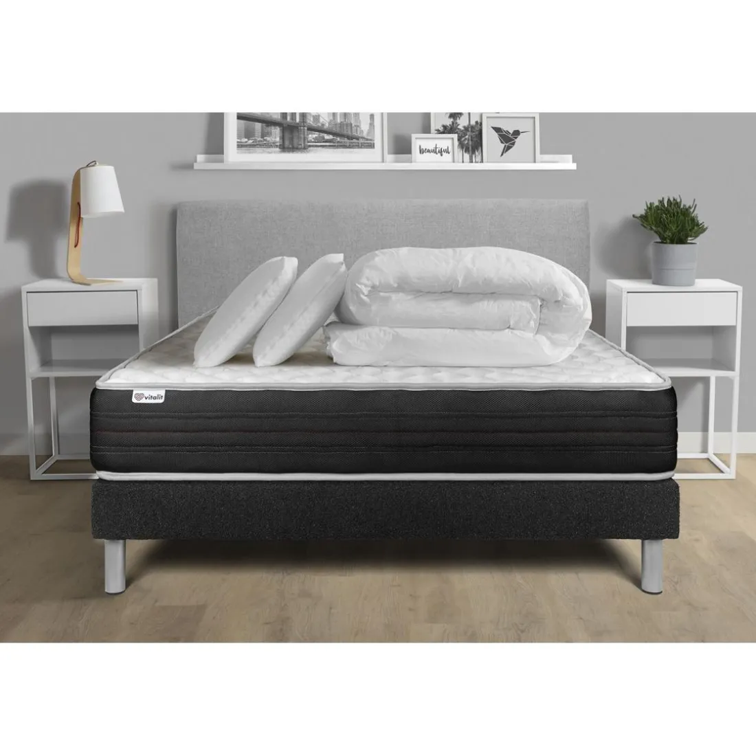 Découvrez le pack prêt à dormir VITALMEMO ONE de la marque VITALIT. Cet ensemble matelas et sommier en kit de couleur noir vous promet des nuits paisibles et réparatrices. Fabriqué en tissu de haute qualité pour une durabilité optimale, il offre un confort inégalable et contribuera à la qualité de votre repos. Son style authentique et sa couleur sombre donneront une touche d’élégance à votre chambre à coucher. L’image illustre la simplicité de son design et de son assemblage. Achetez dès maintenant ce pack pour des nuits de rêves ininterrompues.