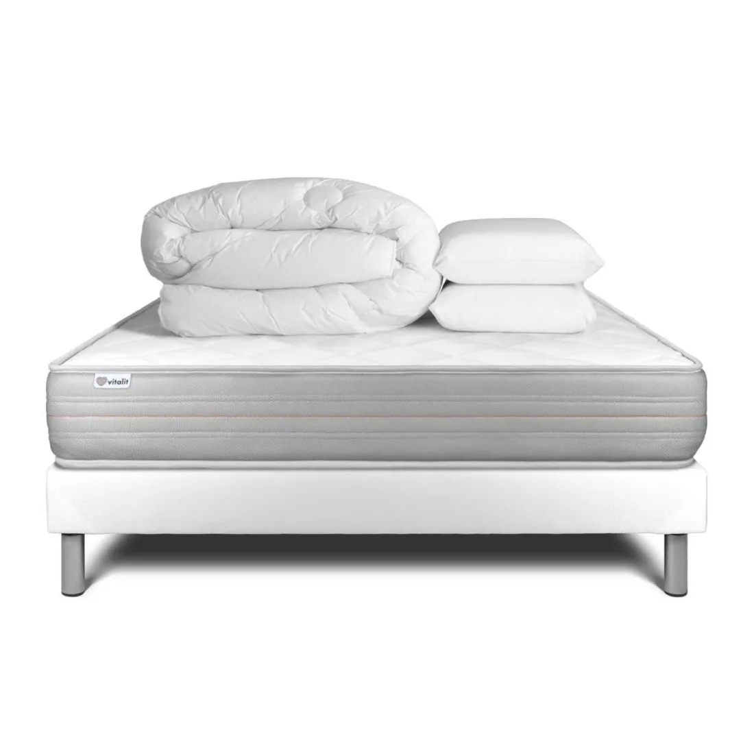 Le Pack prêt à dormir VITALMEMO sommier Kit blanc de la marque VITALIT est un ensemble matelas sommiers qui allient confort et esthétique. Sa couleur blanche et son matériau principal, le tissu, lui confèrent une silhouette sobre et élégante qui s’intègrera facilement à tous les styles de déco. Le look authentique de ce produit se remarque notamment grâce à son image fournie, qui met en valeur ses finitions soignées et sa qualité exceptionnelle. Prêt à l’emploi, cet ensemble vous offre une solution de couchage complète pour des nuits sereines et réparatrices.