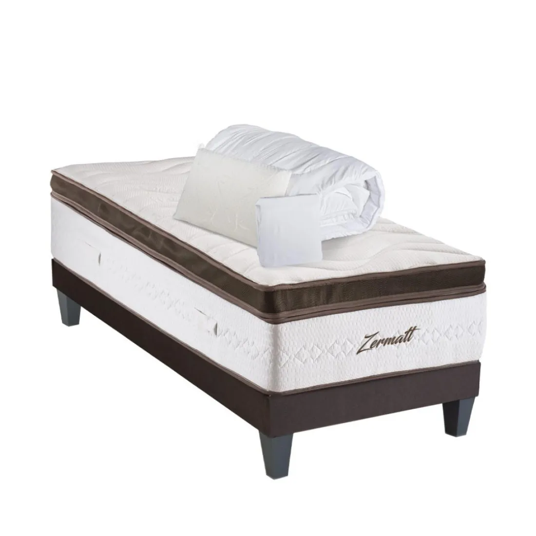 Le Pack Prêt à dormir Zermatt est composé d’1 matelas et d’1 oreiller tous les 2 à mémoire de forme pour un confort optimal, d’1 couette synthétique thermo isolante, d’1 protège matelas absorbant et d’1 sommier à lattes habillé d’un élégant tissu gris anthracite (pieds inclus).