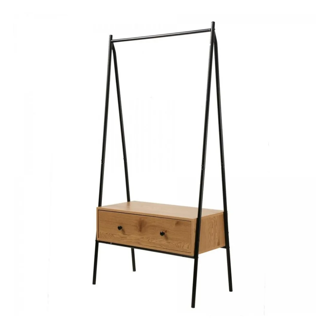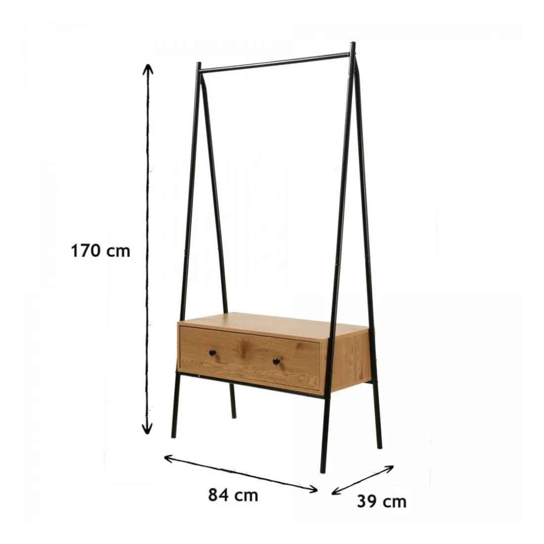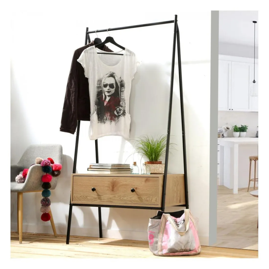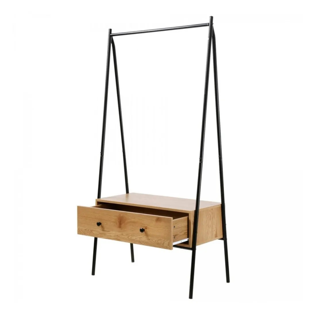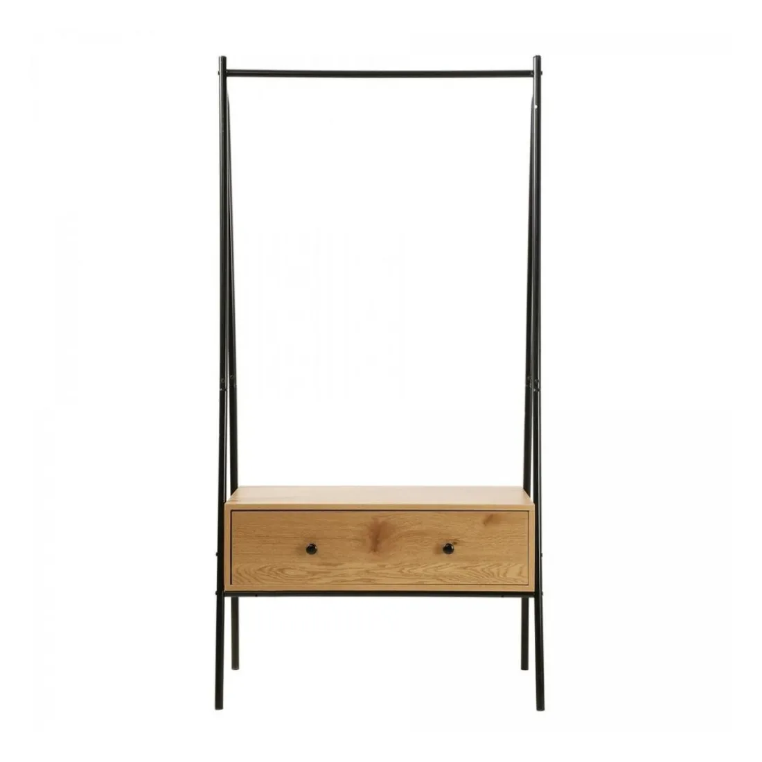 La Penderie en métal Noir avec 1 Tiroir décor Chêne Calicosy est non seulement fonctionnelle mais aussi esthétiquement raffinée. Sa structure principale, robuste et en métal noir, soutient un grand espace de rangement ouvert idéal pour pendre vos vêtements. En-dessous, un tiroir décor chêne apporte une touche de couleur Beige et offre un espace de stockage supplémentaire. Cette penderie élégante et contemporaine sera une addition valorisante à votre intérieur.