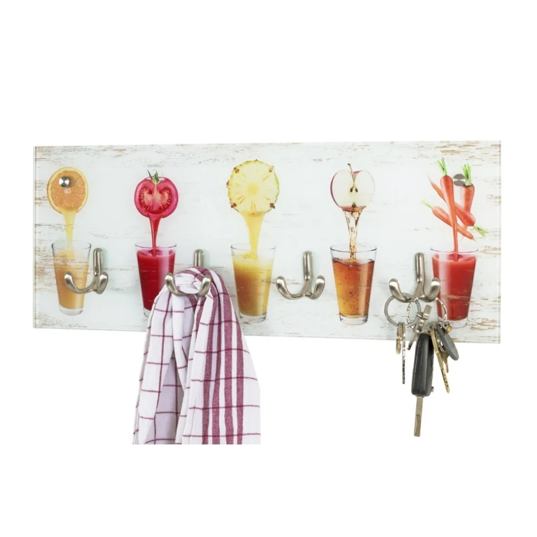 Ce portant à vêtement mural de marque 3S. x Home est conçu en verre trempé avec un motif imprimé de verre de jus de fruits, ajoutant une touche ludique à votre chambre. Il brille par sa robustesse et son élégance. Il dispose de 4 crochets en optique inox offrant un bon nombre de suspensions pour vos vêtements. Ce produit appartient à la catégorie Portants, valet de chambre. Sa présence illumine immédiatement la pièce avec sa belle impression de fruit.