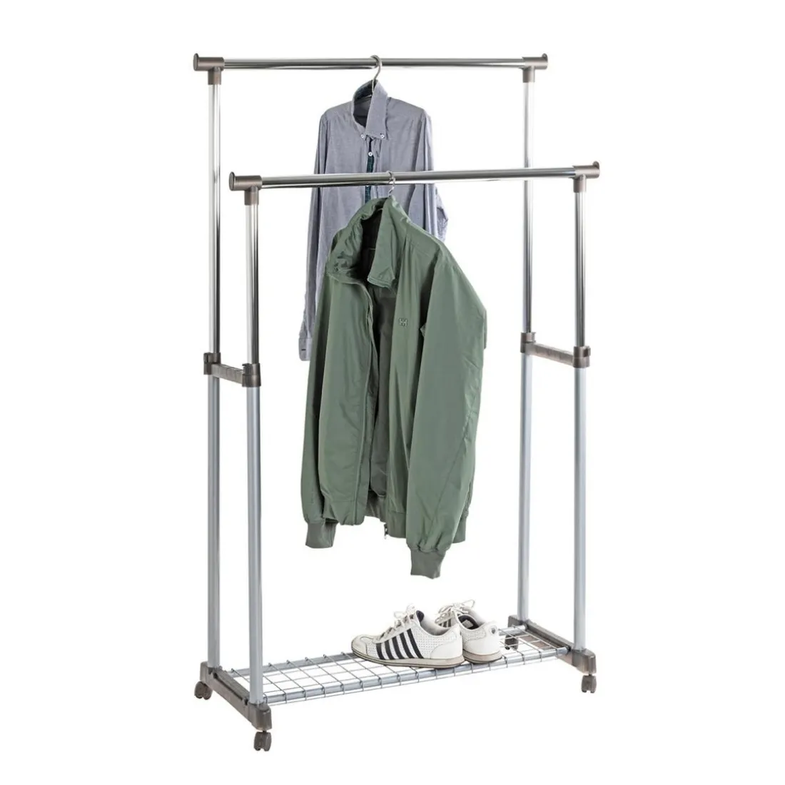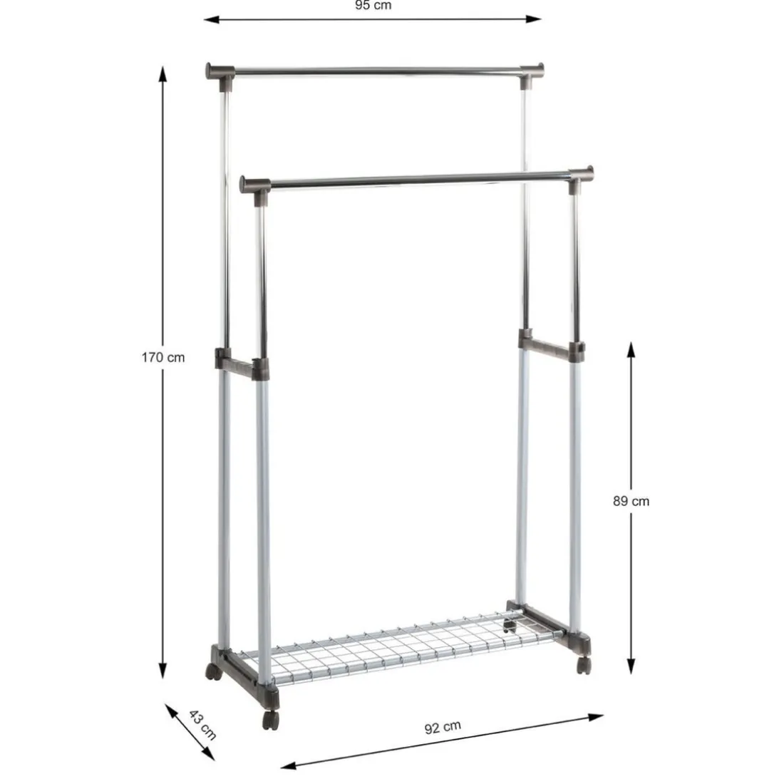 Le Portant sur roulettes 3S. x Home est un élément de rangement pratique et réglable. Composé d’acier et de plastique, il présente deux barres réglables en hauteur, montées sur des roulettes pour une mobilité aisée. Sa longueur de 95cm offre un espace de suspension généreux. Le portant a une hauteur maximale de 170cm. D’une couleur gris neutre, il s’intègre facilement à tout décor de chambre. Sa robustesse et sa polyvalence en font un choix excellent pour toute maison.