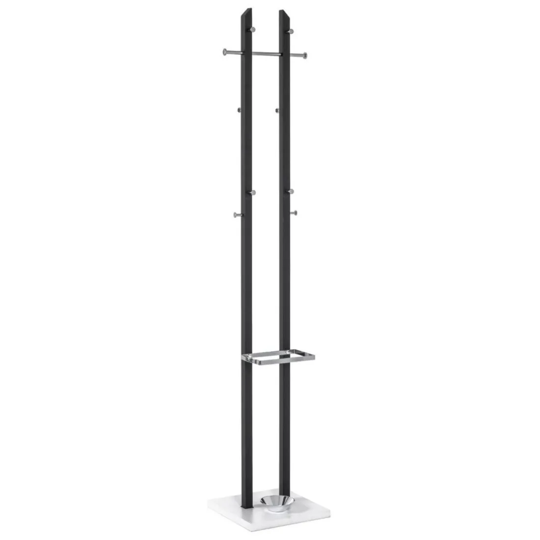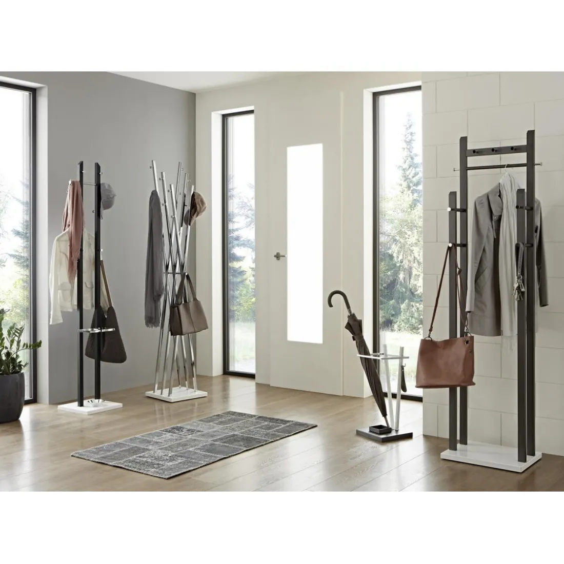 Tube d’acier époxy noir, crochets chromé, porte parapluie et égouttoir chromé, pied en métal laqué blanc