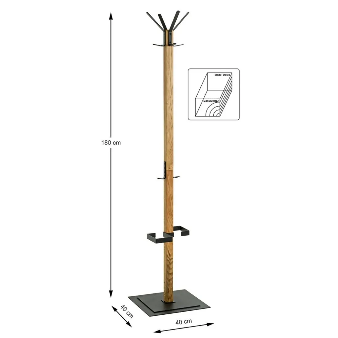 Ce porte-manteau de la marque 3S. x Home aux accents modernes et élégants présente une structure robuste en chêne massif huilé, complétée par des crochets, un porte-parapluies et un pied massif en métal noir revêtu de poudre. Le contraste du bois naturel et du noir métallique donne à ce porte-manteau une sophistication subtile, en faisant un ajout parfait à tout intérieur contemporain. Mesurant 180 cm de haut, il apporte un rangement vertical pratique, parfait pour les vêtements d’extérieur.