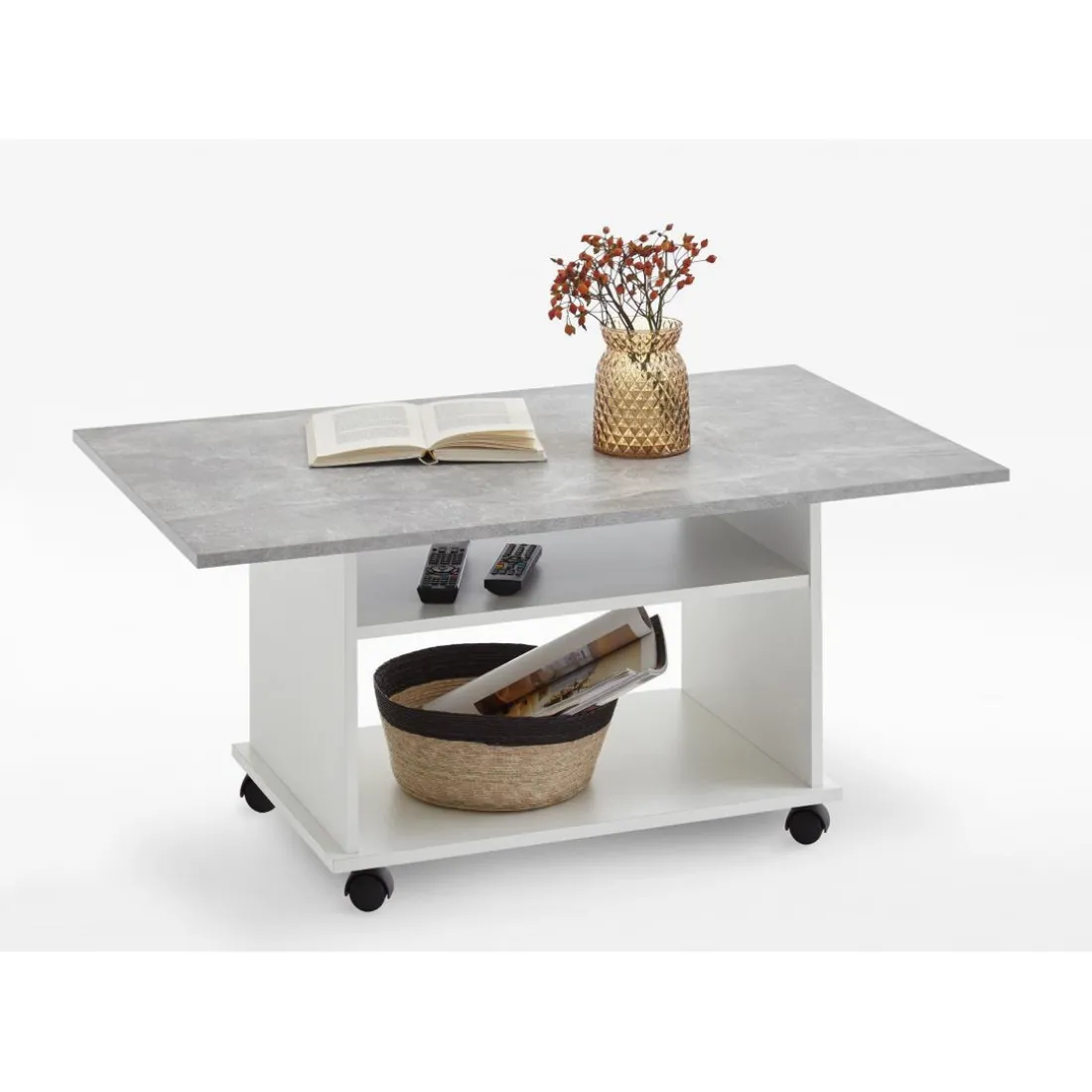Astucieuse et design, cette Table basse ELOA se placera parfaitement dans un séjour moderne ou classique. Elle se caractérise par ses deux niches qui vous permettront d’avoir à portée de main vos revues, clé, télécommandes … Ses couleurs béton et blanc illumineront votre déco. Son plus : ses roulettes qui en font un meuble fonctionnel.