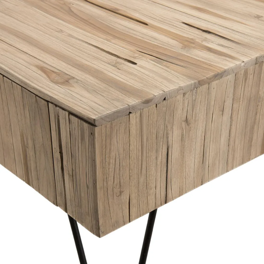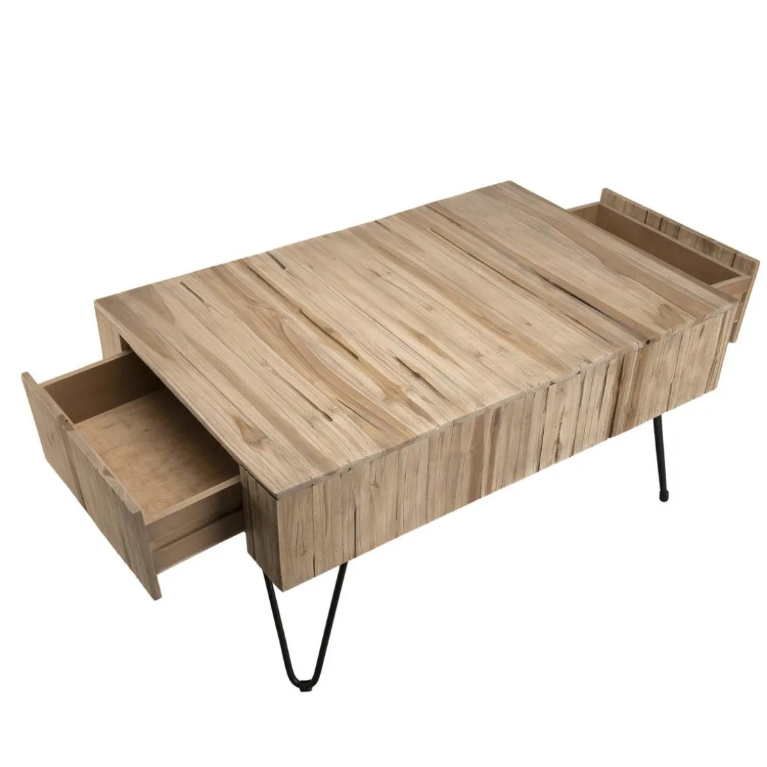 Caractéristiques Table Basse CLEMENCE Bois Nature 2 Tiroirs Branches Teck – Pieds Épingles Scandi Métal