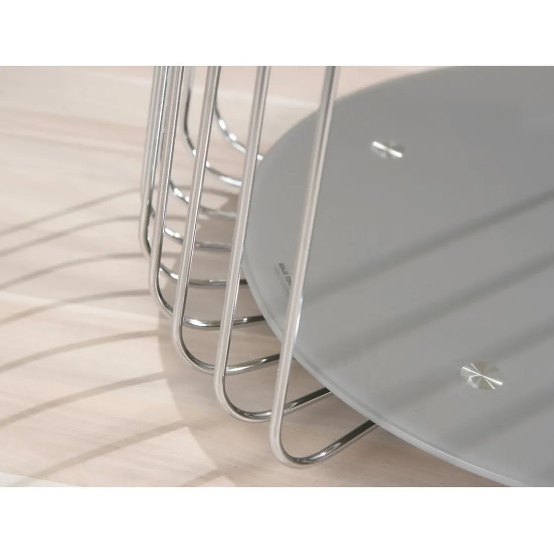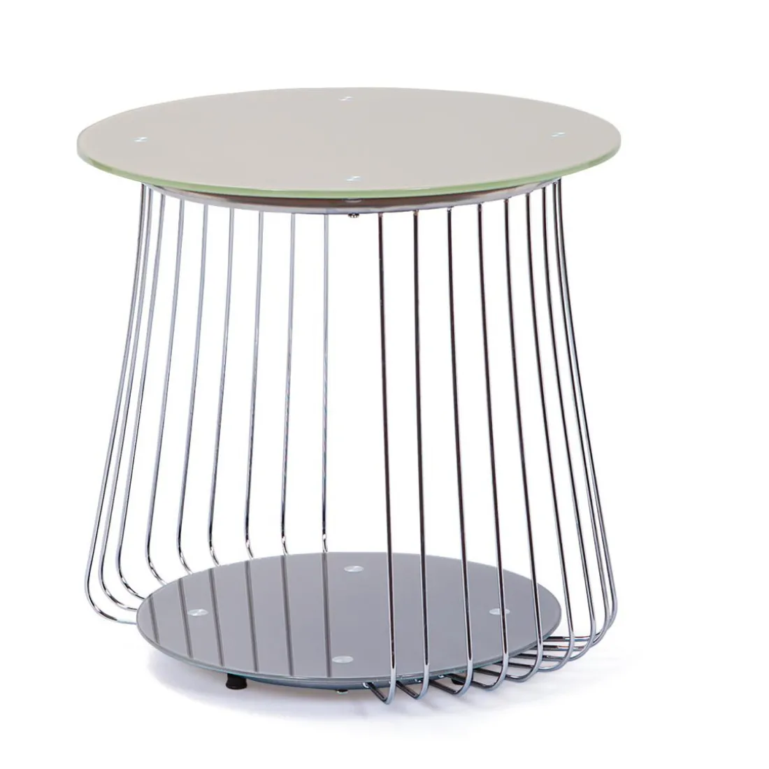 Table basse au design moderne. Plateaux couleur cappuccino, ronds en verre sécurit satiné. Coté original de la table, les montants faits de tiges en métal chromé. Originale cette table s’adaptera aisément à votre intérieur.